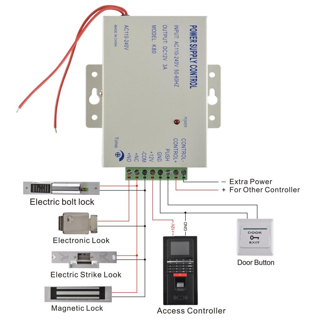 This device can connect with magnetic lock/electroniclock or bolt lock. When the enrolled fingerprint punch,the door will open. Acomplete access control system consists of (1) Fingerprint machine, (2) Exit button,(3) Electric lock, (4) Special power supply.