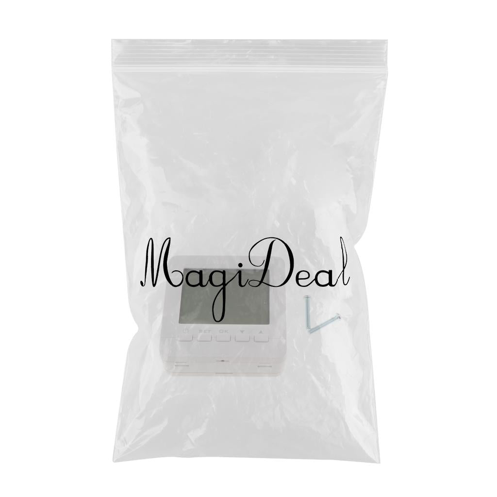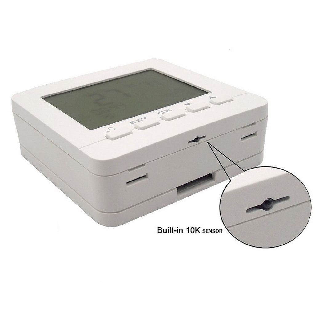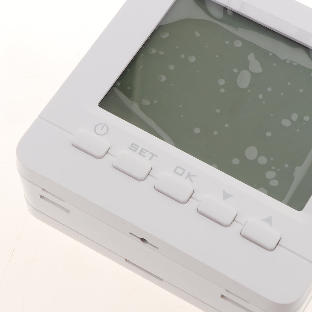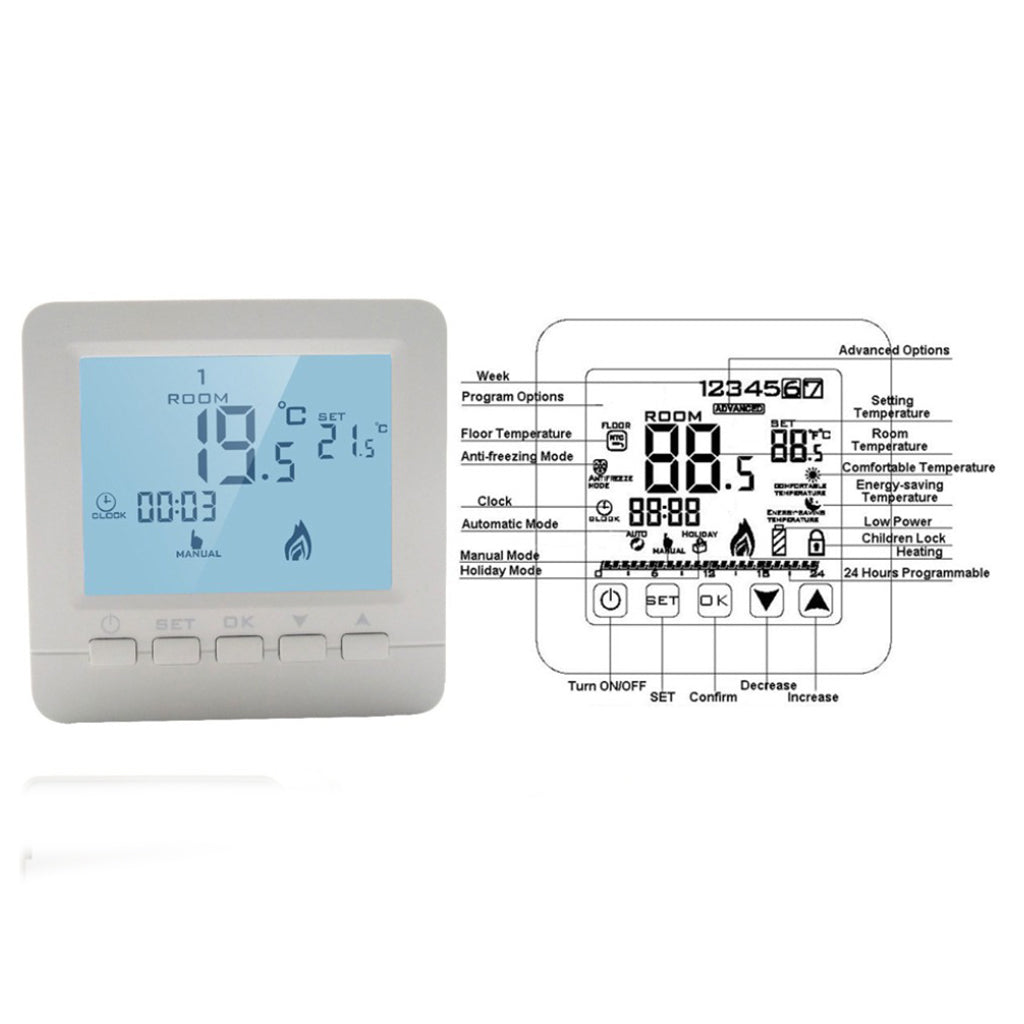 FEATURES - ①Large LCD touch screen with LCE blue backlight display,②double temperature display mode,③Time display (minutes, hours, weeks); ④6 period programmable temperature setting; ⑤Internal and external temperature sensor; ⑥display precision is 0.5,inner precision is 0.1; ⑦Room temperature automatically calibration function