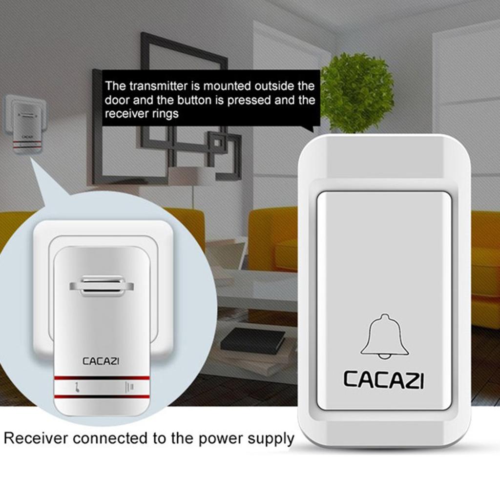 No batteries required for the receiver, just plug it into an electrical outlet. Transmitter can be fixed on wall or doorframe with adhesive tape.