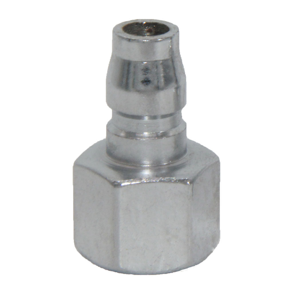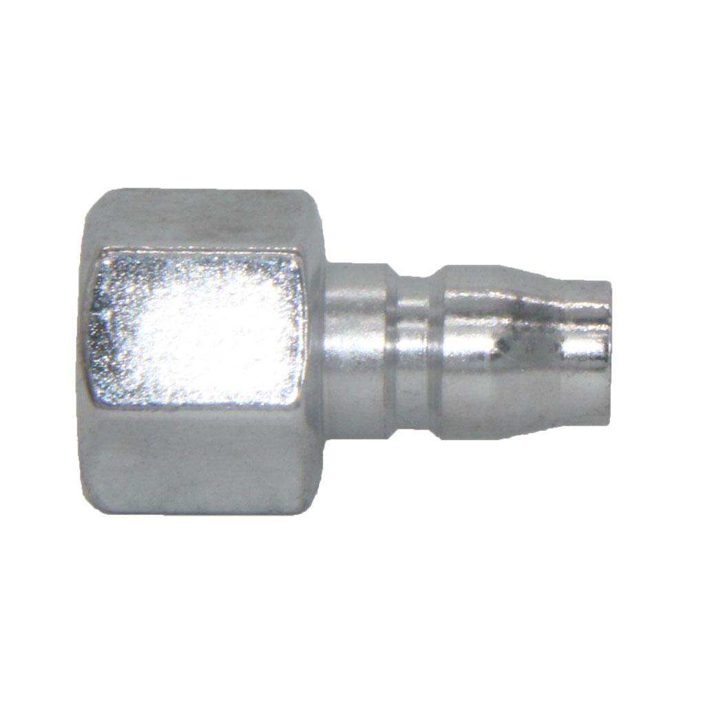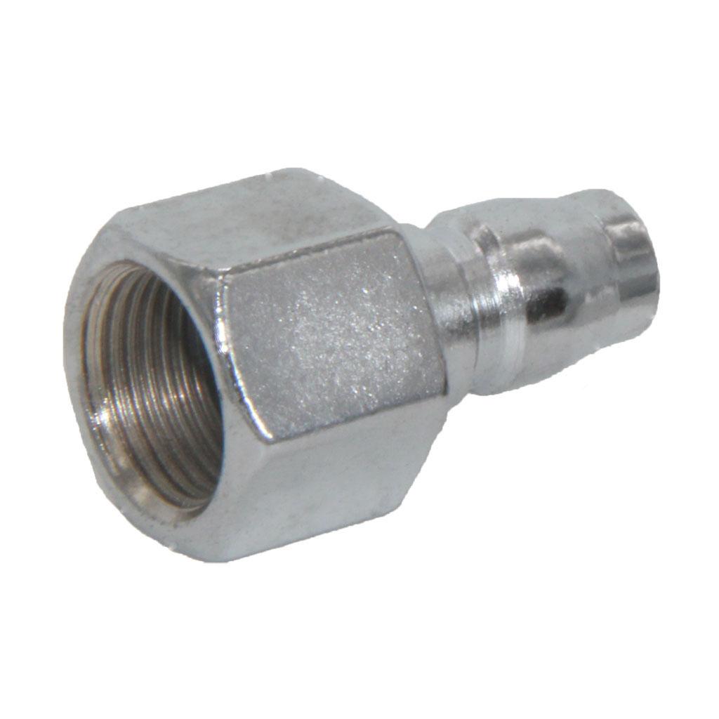 Carbon steel quick coupler, features female thread to hose barb type, straight design, silver tone in color.