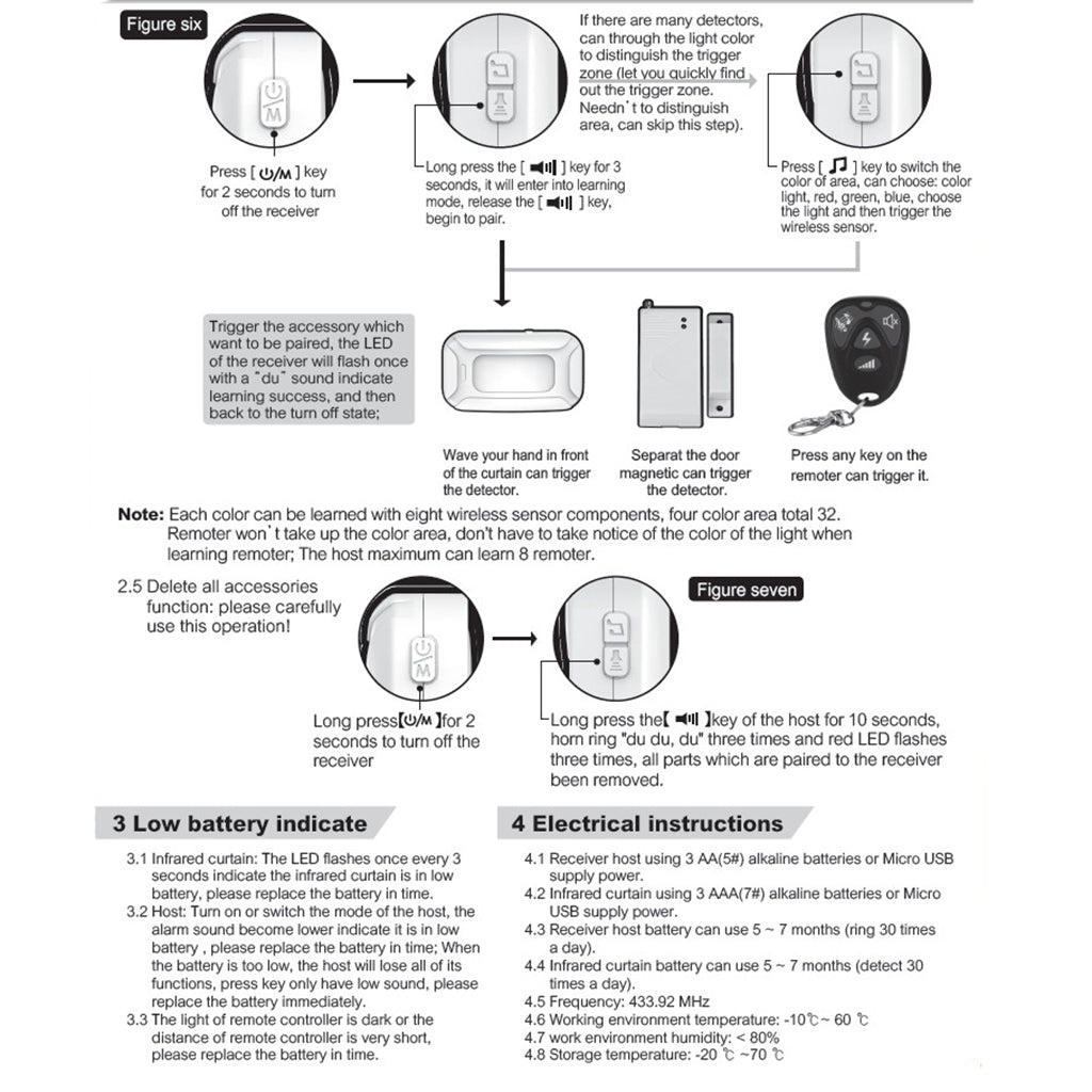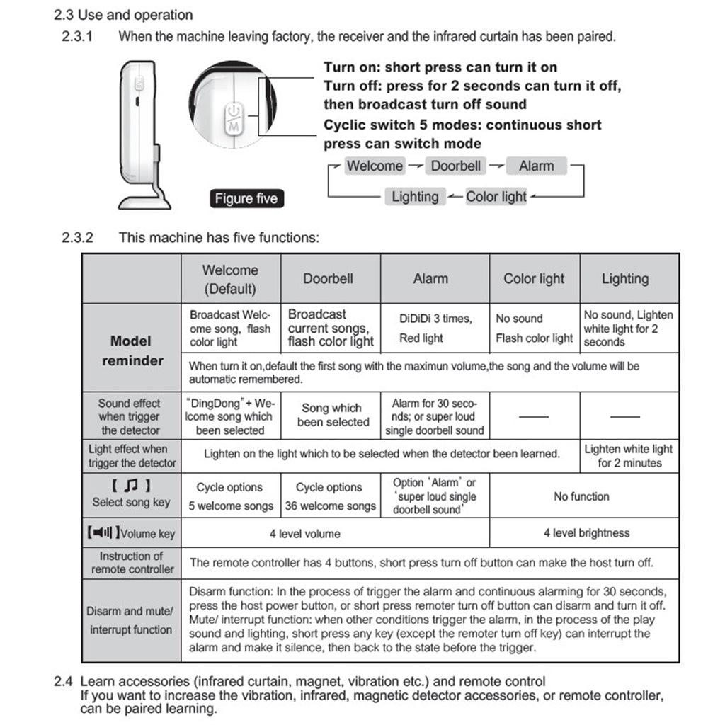 Welcome Mode: when the infrared sensor detects someone, it will send a message to the doorbell receiver, then the doorbell receiver can generate a "Hello, Welcome".