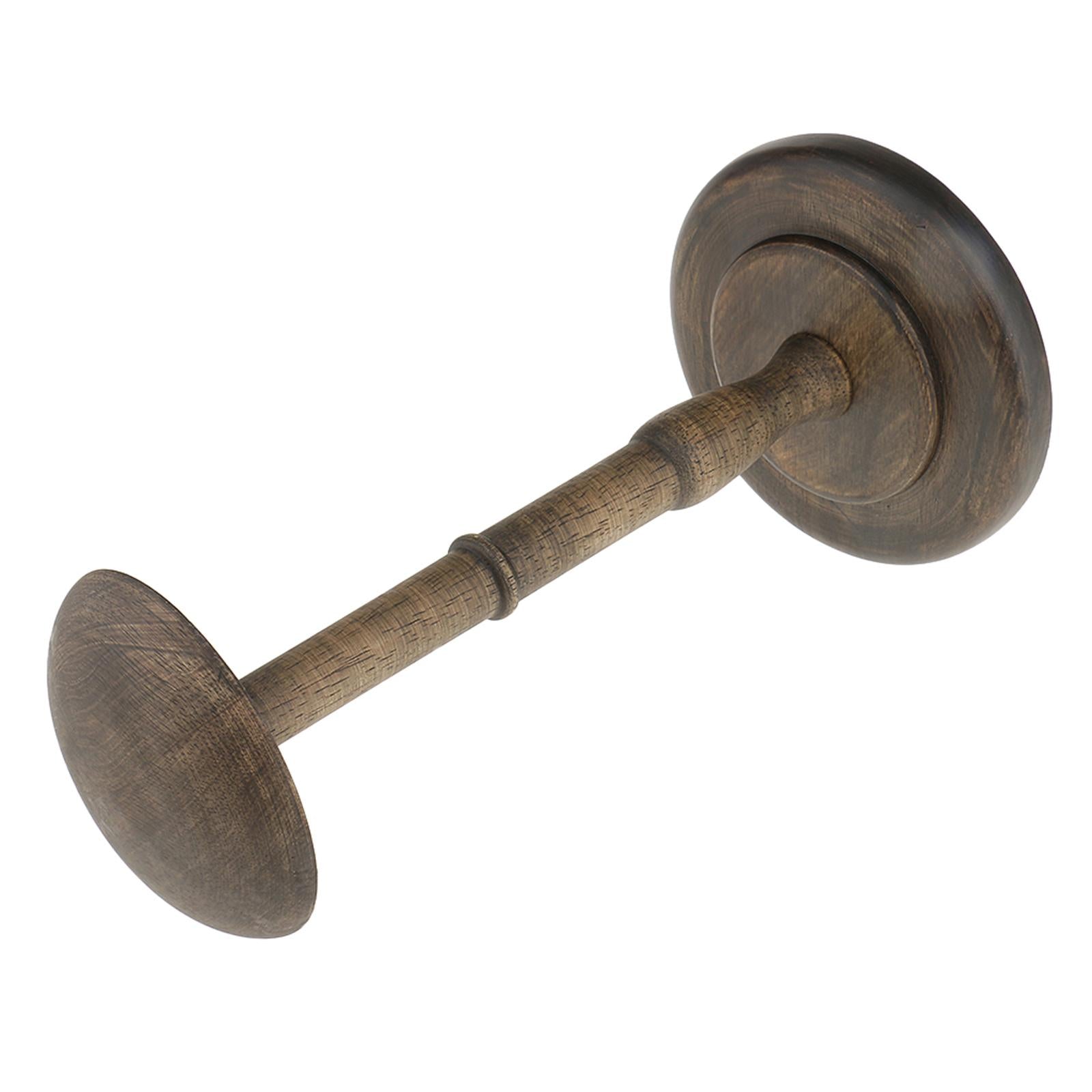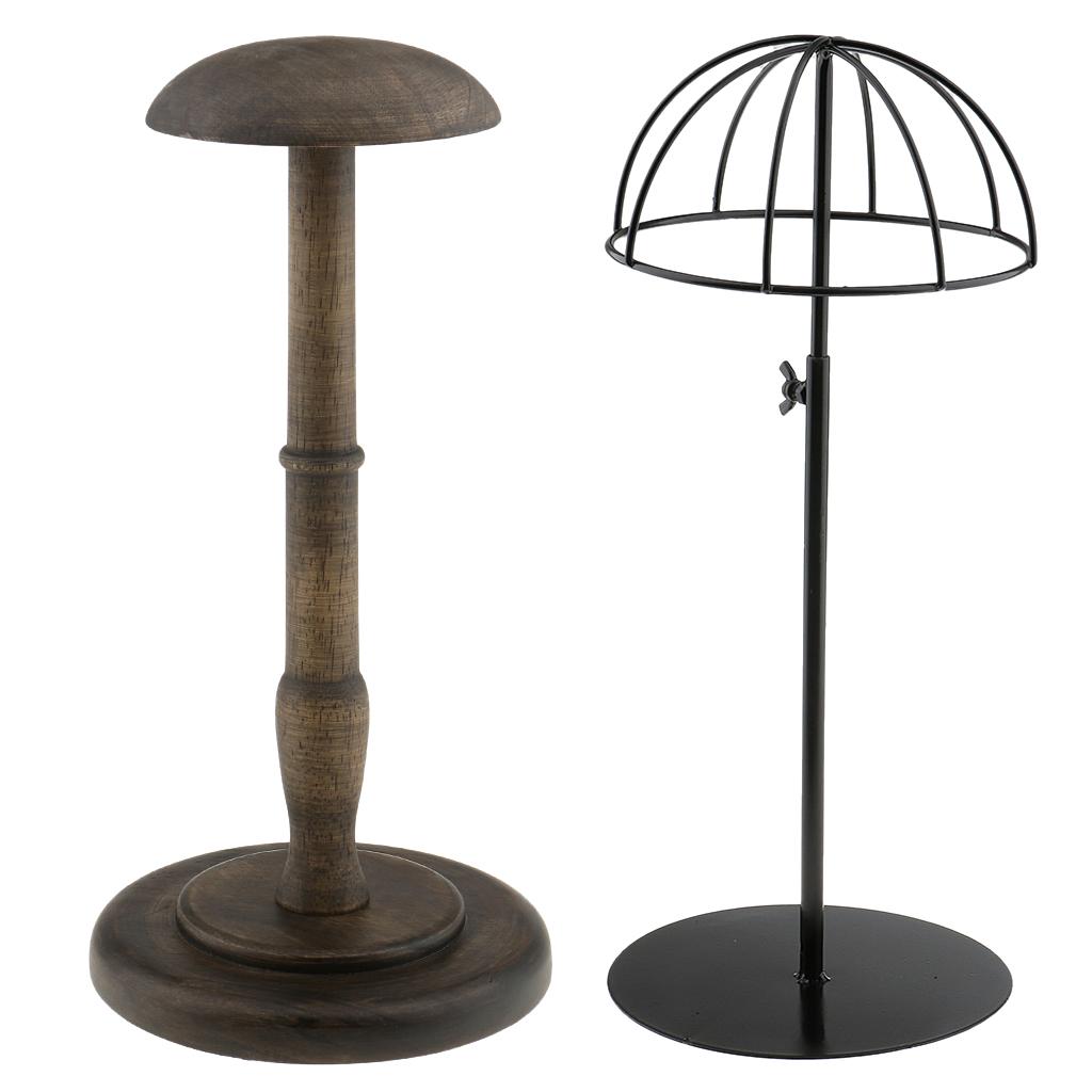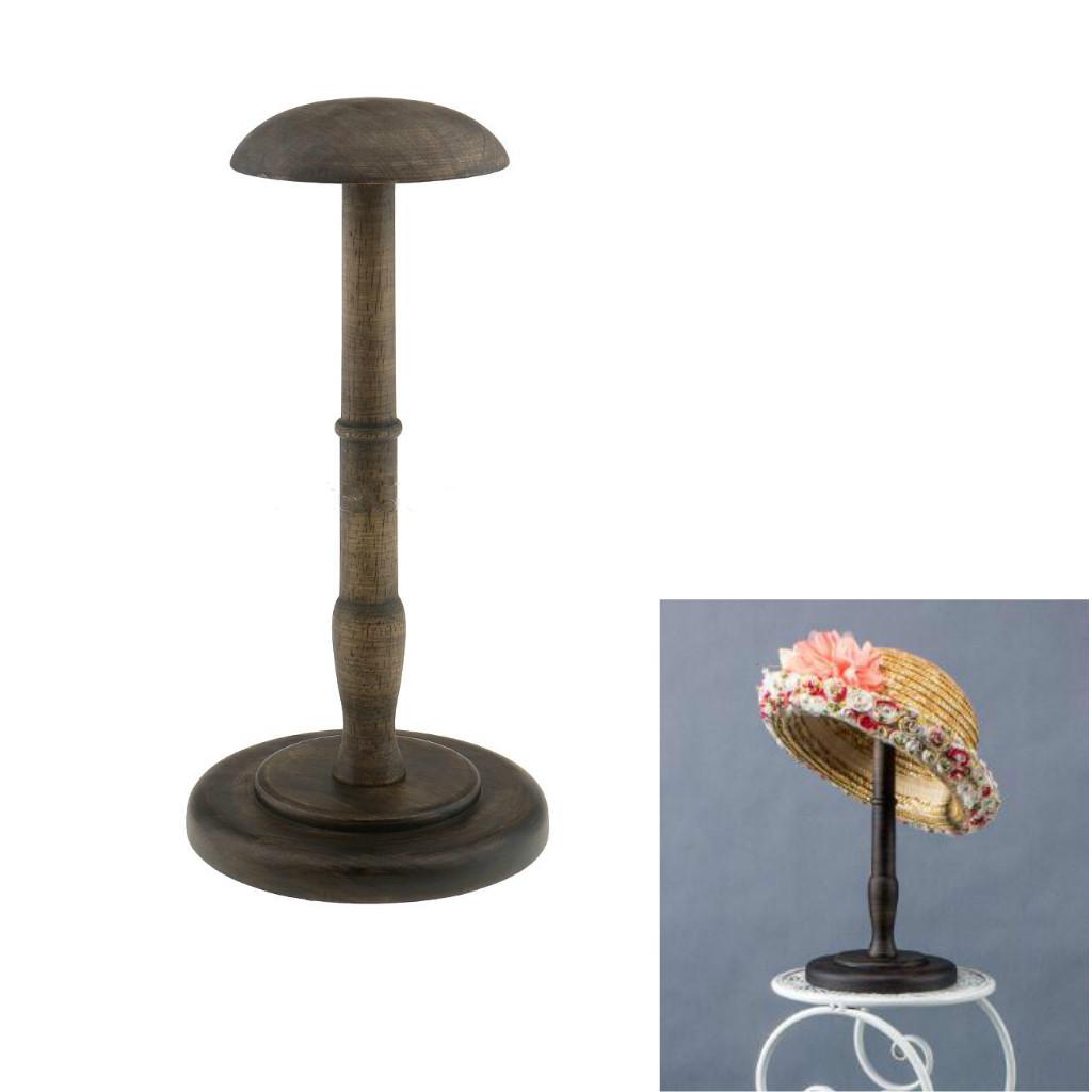 Straight wooden stem and round base help keep this hat/wig stand sturdy and upright