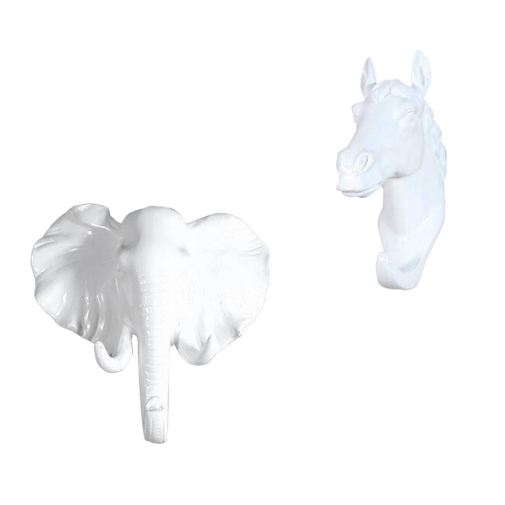 2x Wall Mounted Resin Coat Hat Hooks Rustic White Elephant + Horse Pattern
