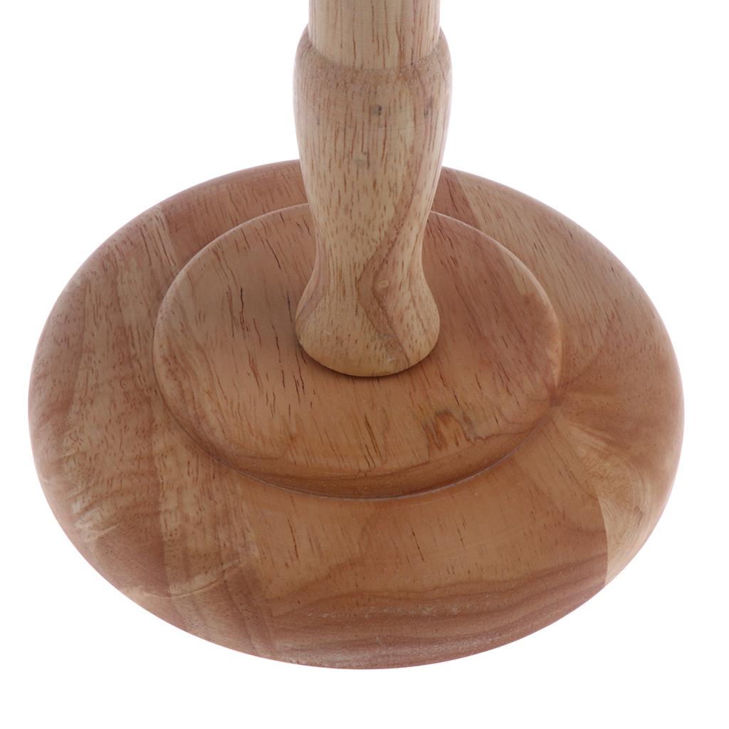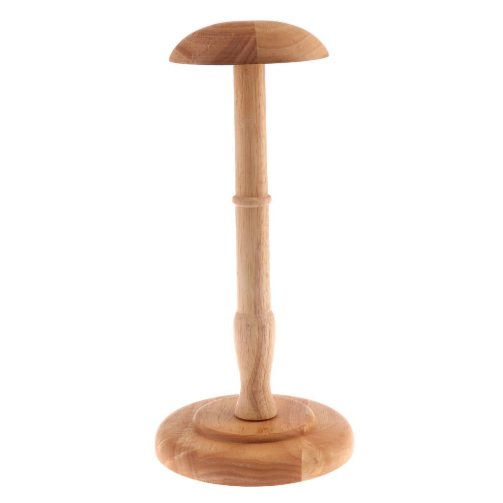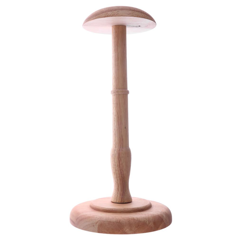 Straight wooden stem and round base help keep this hat/wig stand sturdy and upright