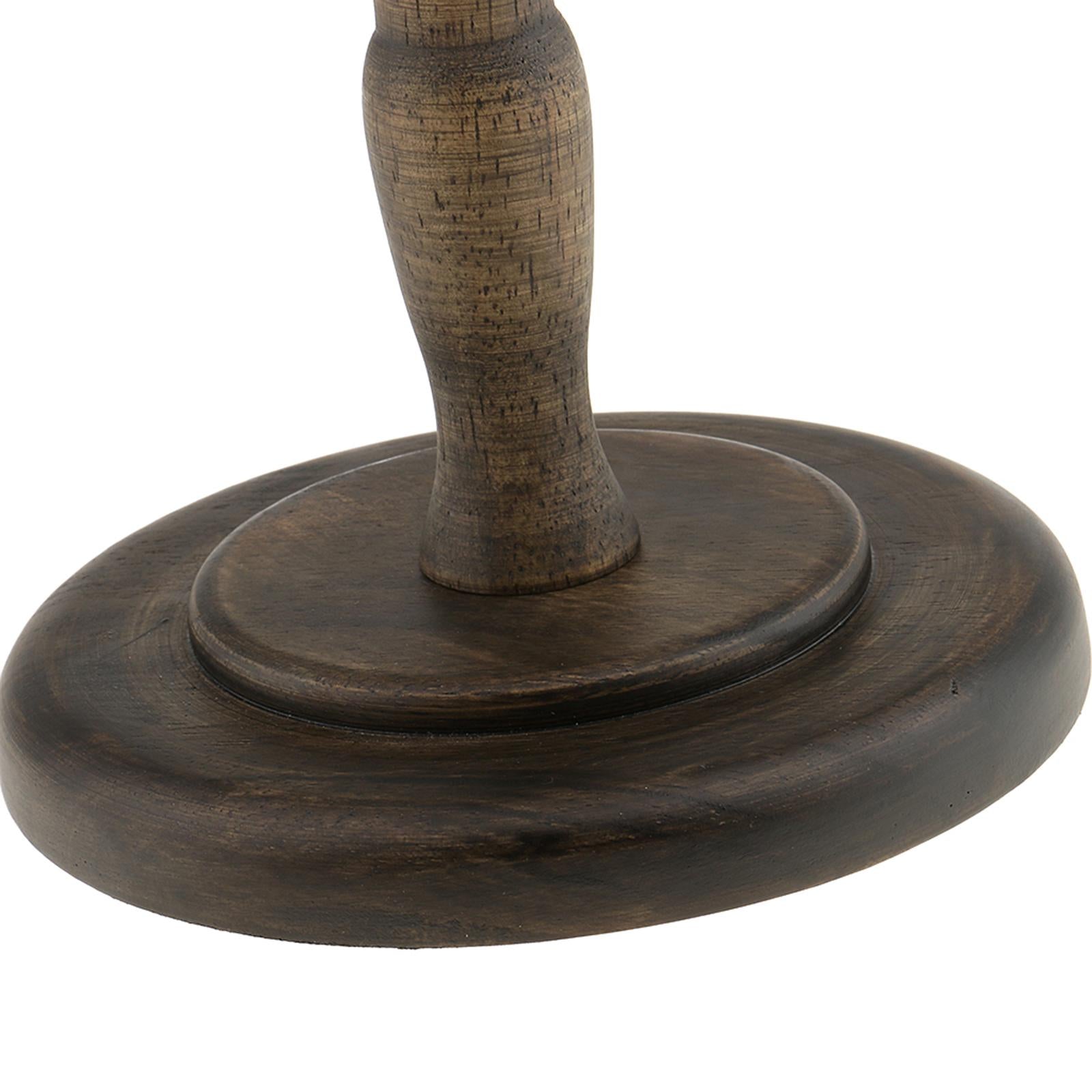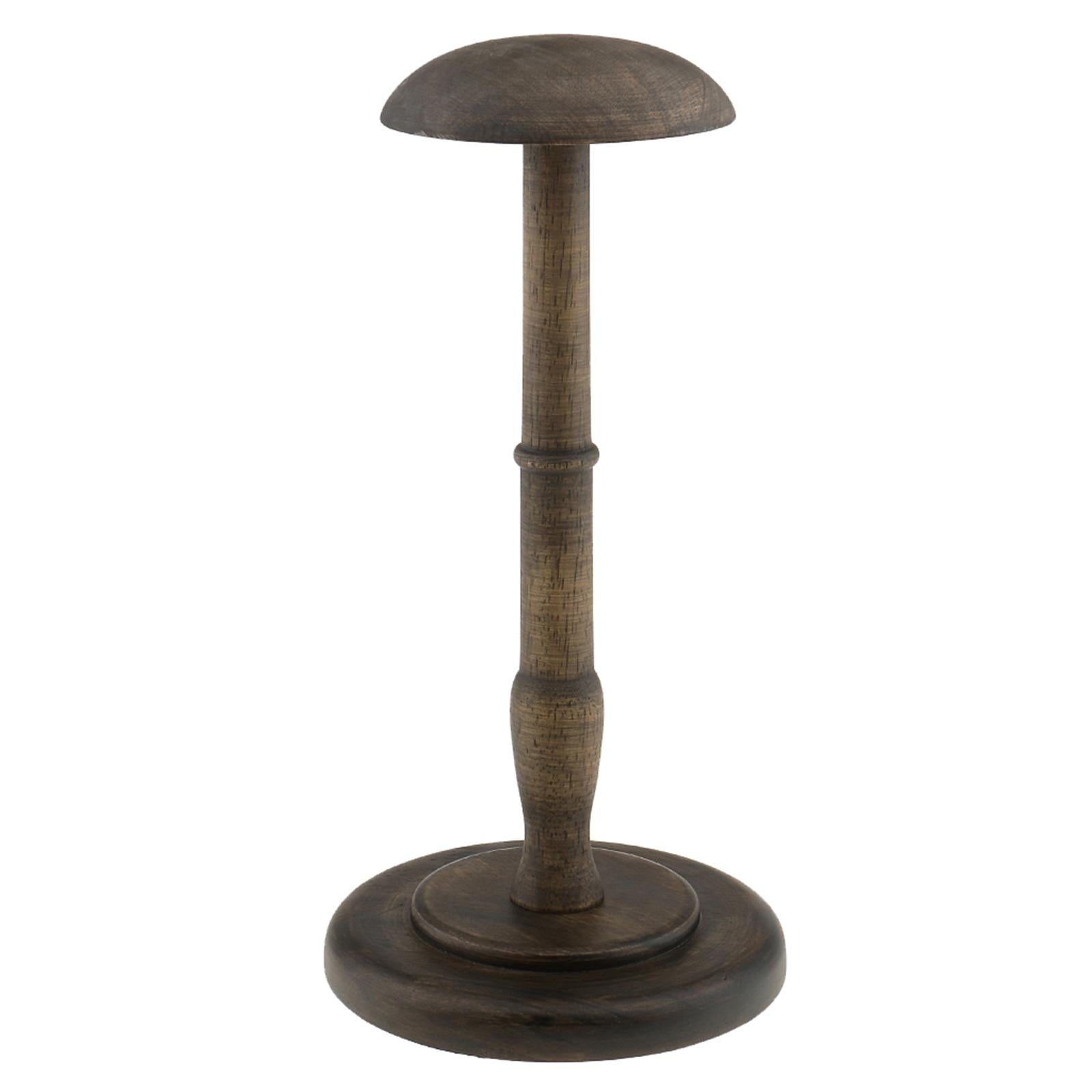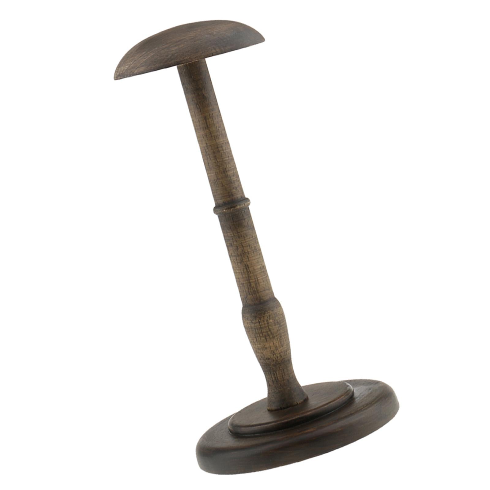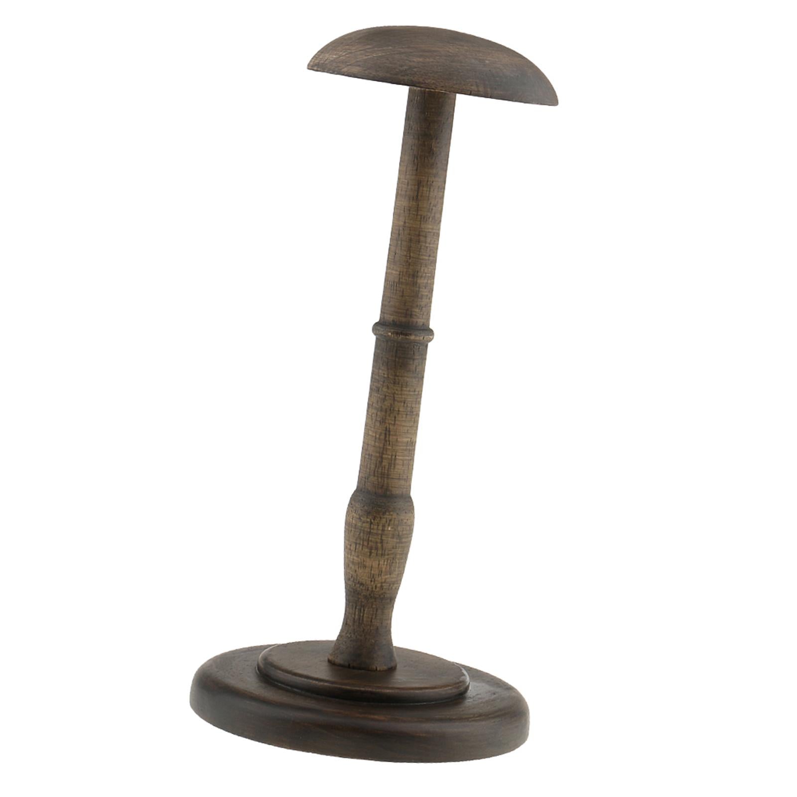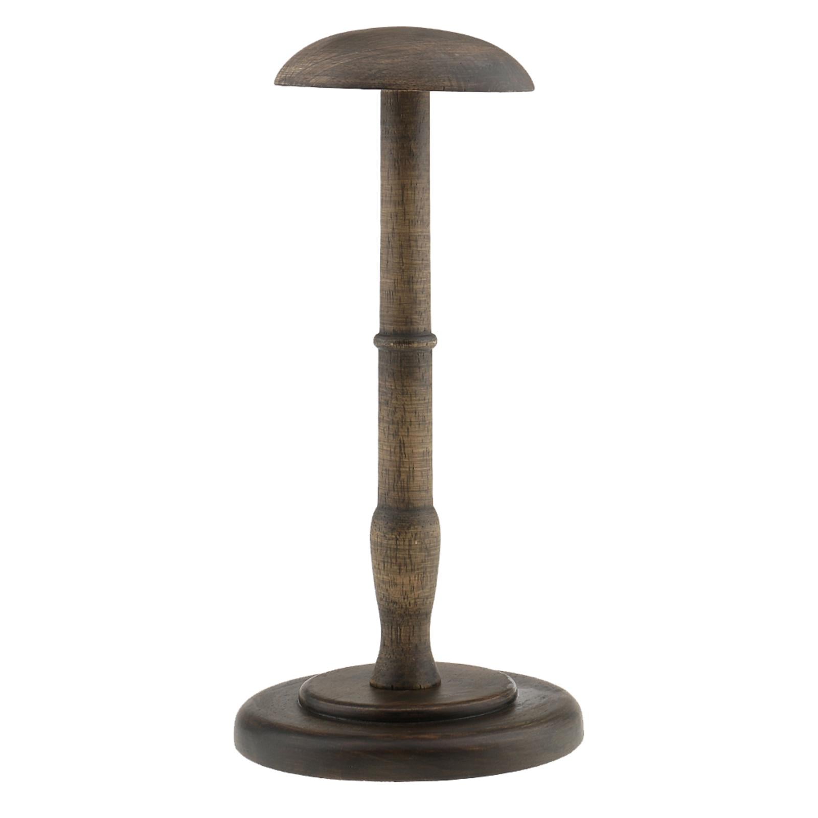 Straight wooden stem and round base help keep this hat/wig stand sturdy and upright