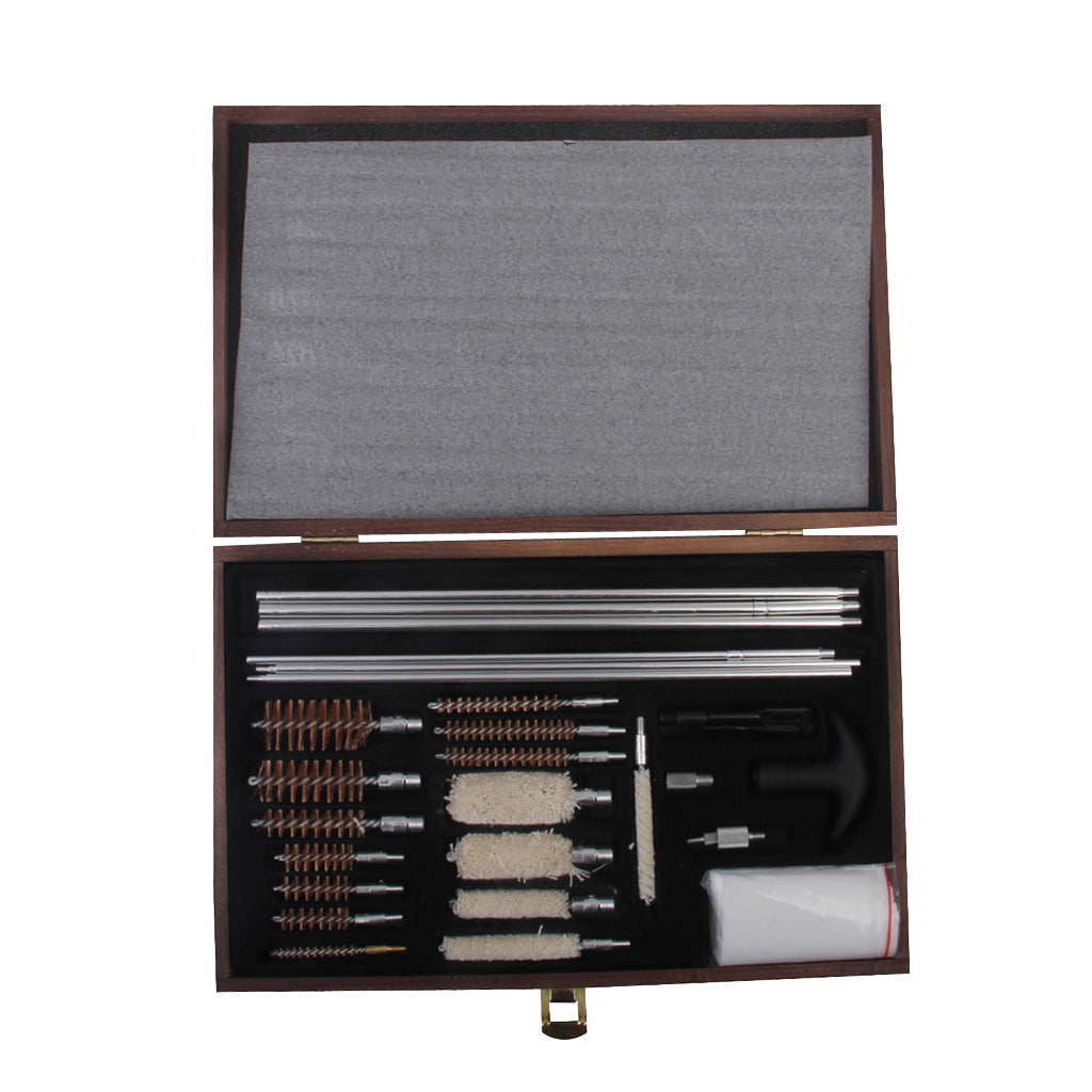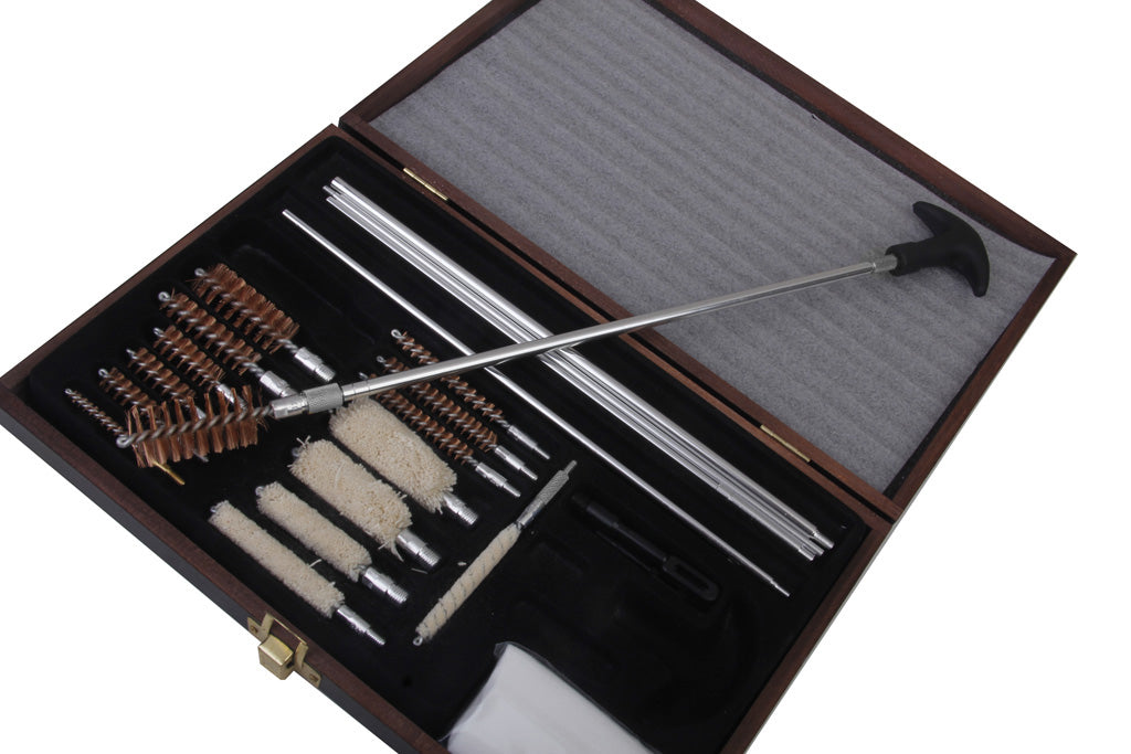 28 Pieces of aluminum rods, brass brushes, fittings and accessories plus 50 cleaning pads, this is a great cleaning kit which will fit the vast majority of rifles and pistols.