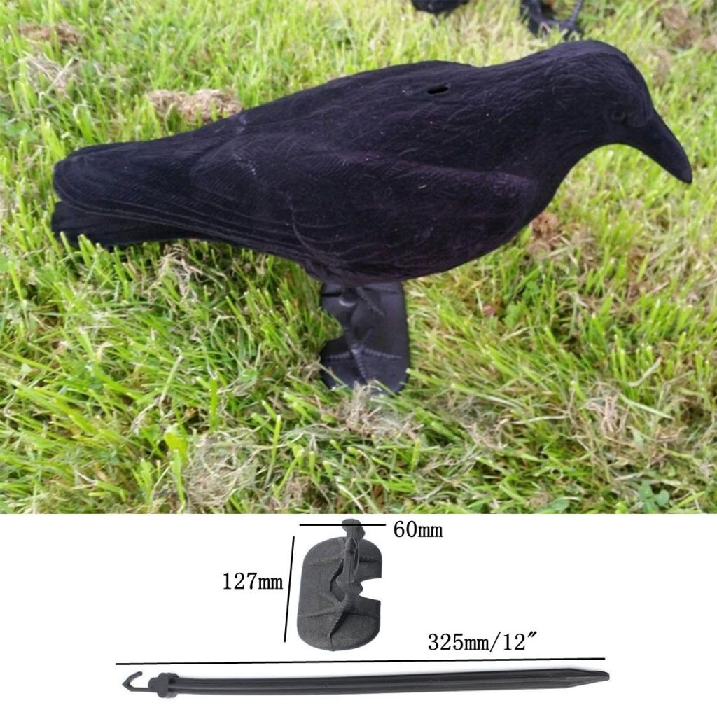 • moulded in stake of 12 inches long and comes with feet of 5 inches long,making it possible to place the crow upright on the ground or put it down in the top of a old cracked or hollow fence post.