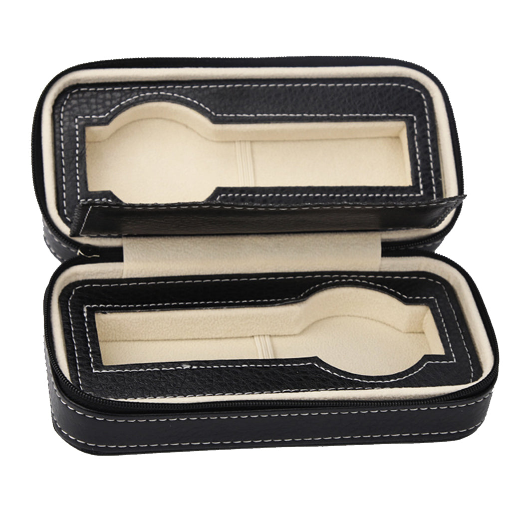 2 Slots Genuine Leather Watch Travel Case Collector Storage Zipper Box Black
