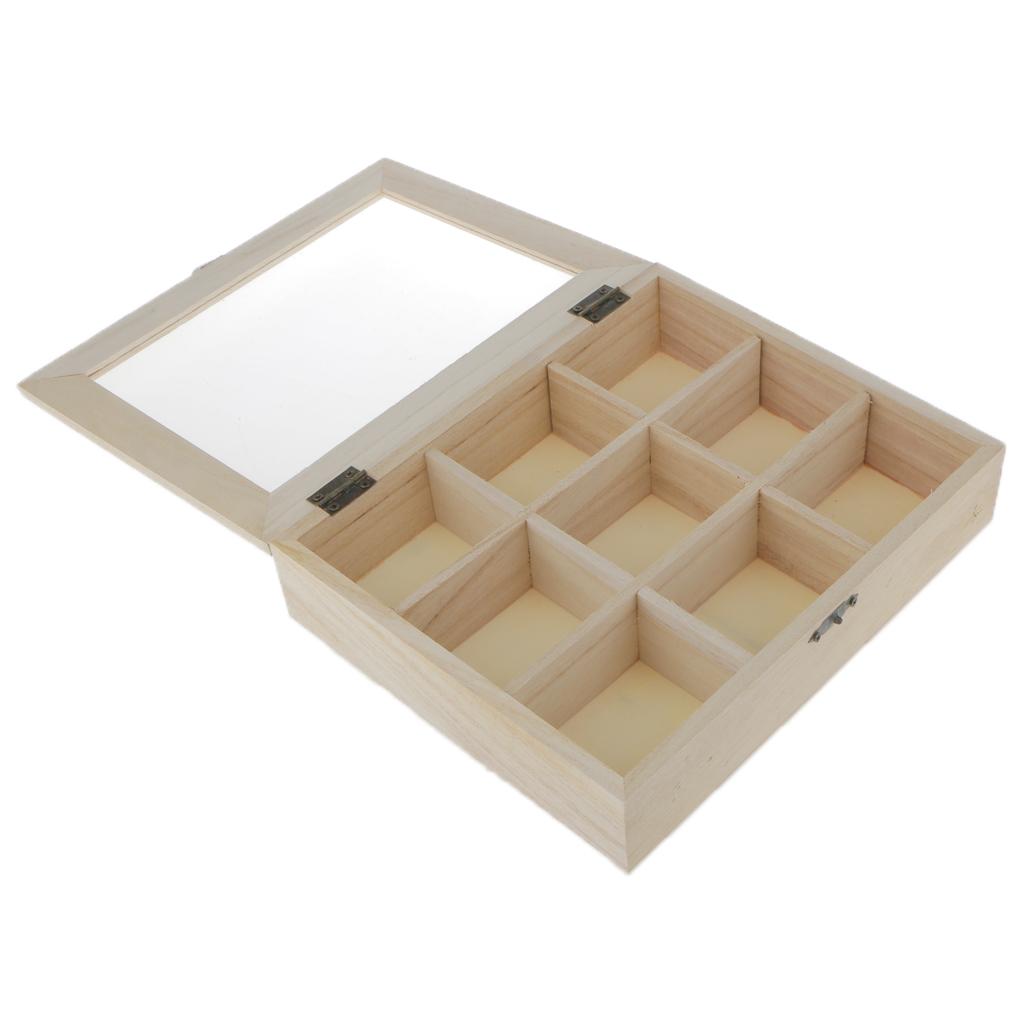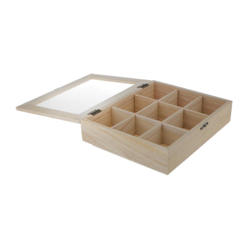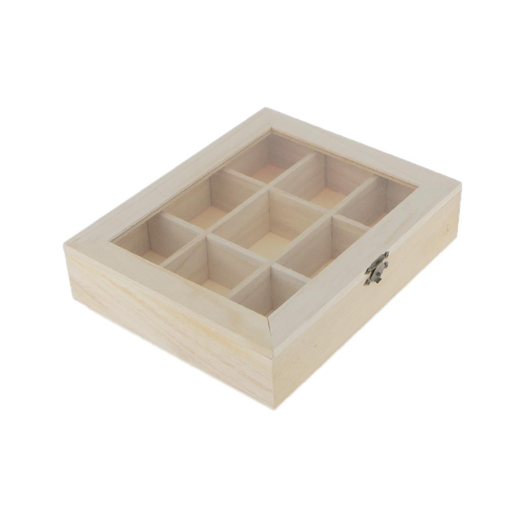 Plain unfinished wooden jewellery case / storage box 9/4 grids with glass cover and 3 layers storage box