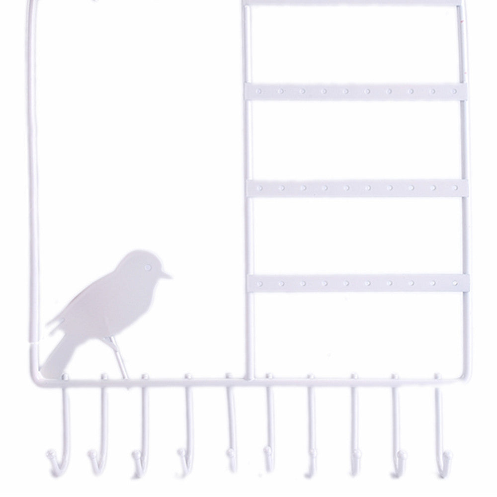 • GORGEOUS AVIARY DESIGN. Wall mounted jewelry organizer is shaped like a birdcage, adorned with a sparrow silhouette and bar detail.