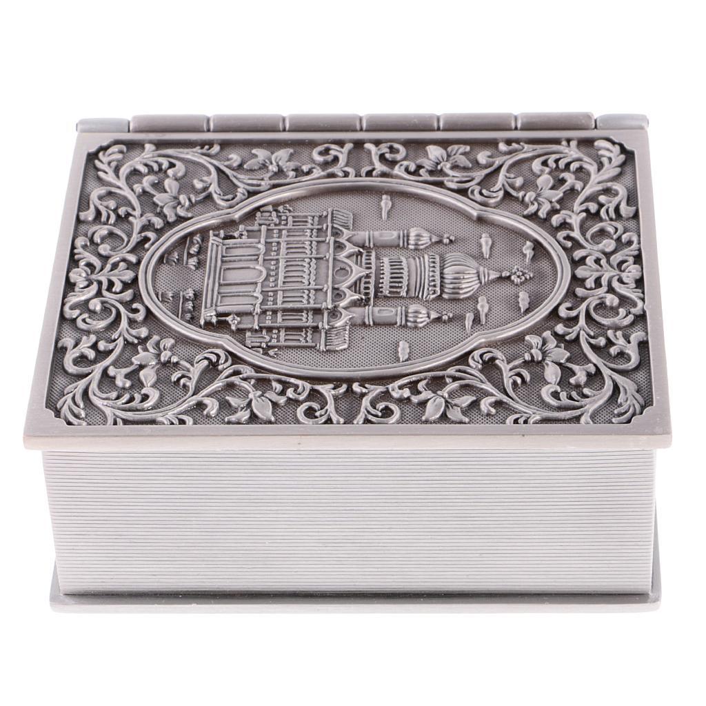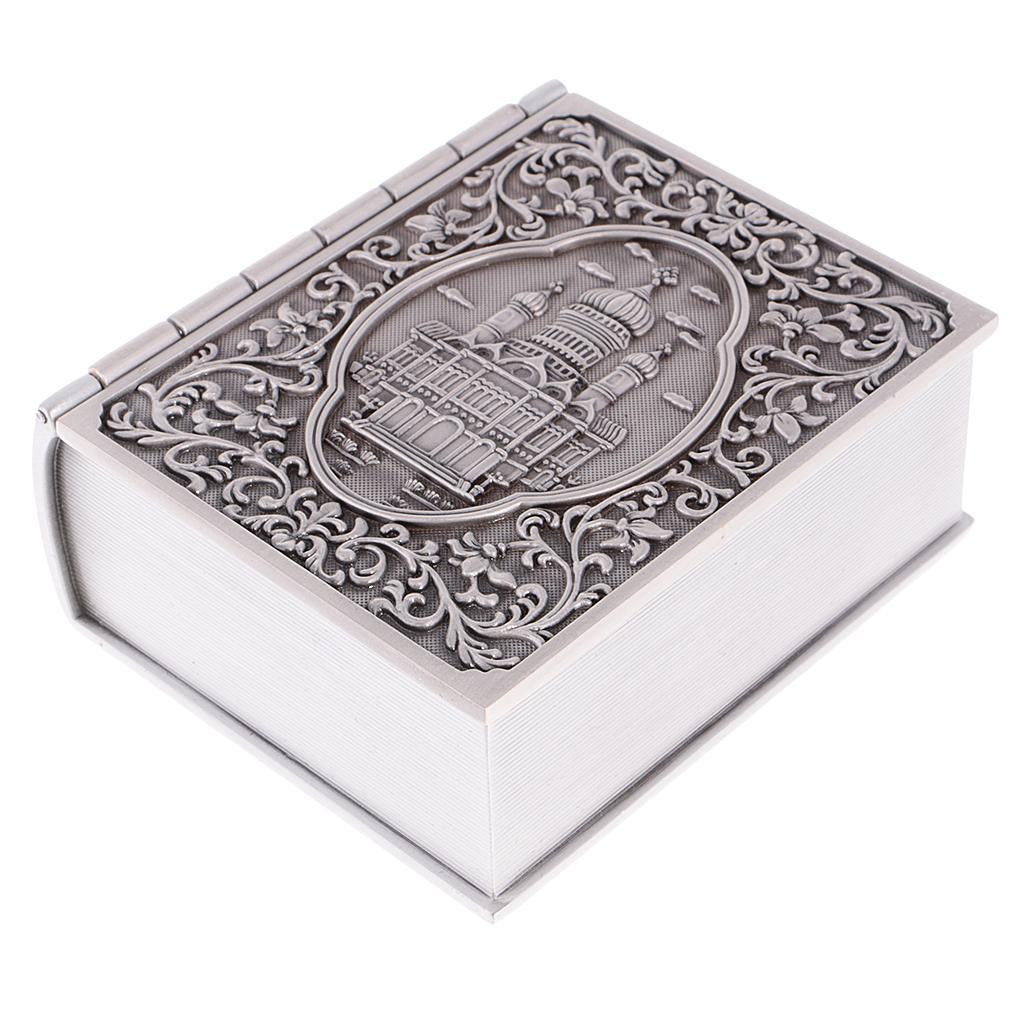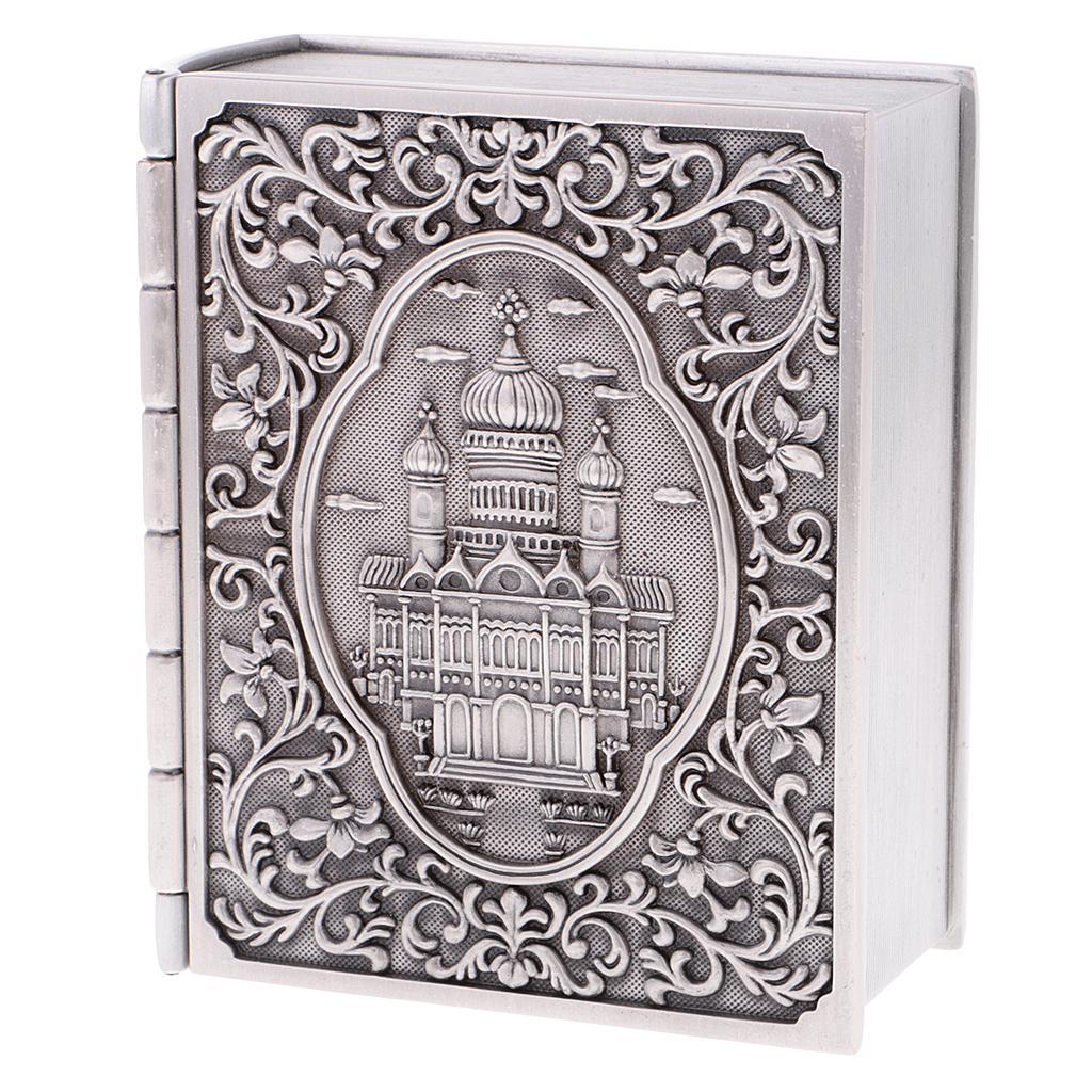 Beautiful book-shaped jewelry box engraved with filigree detailing & a castle