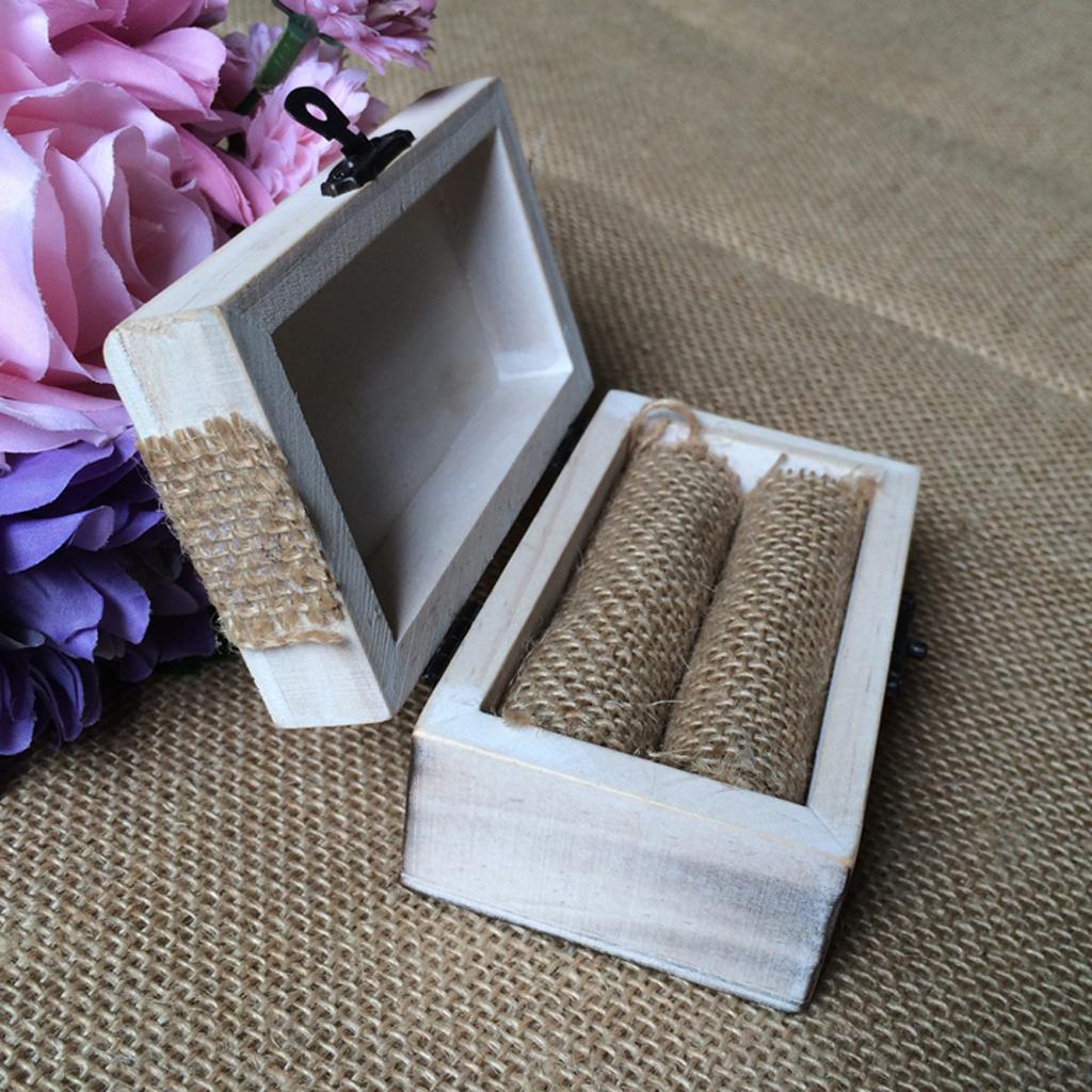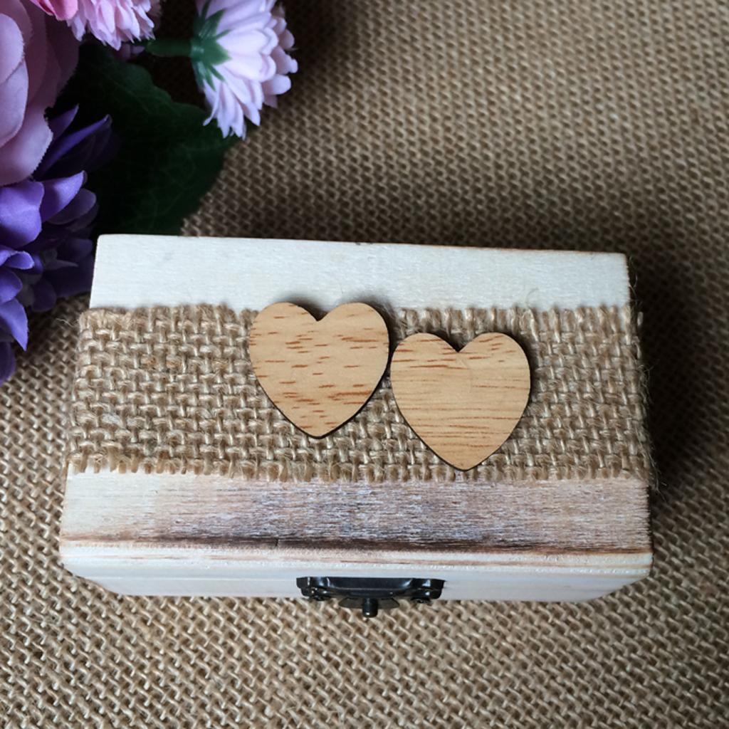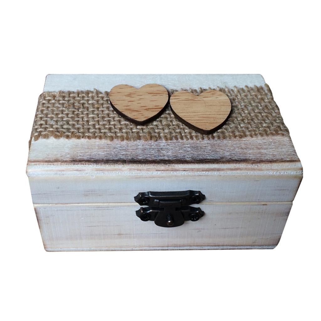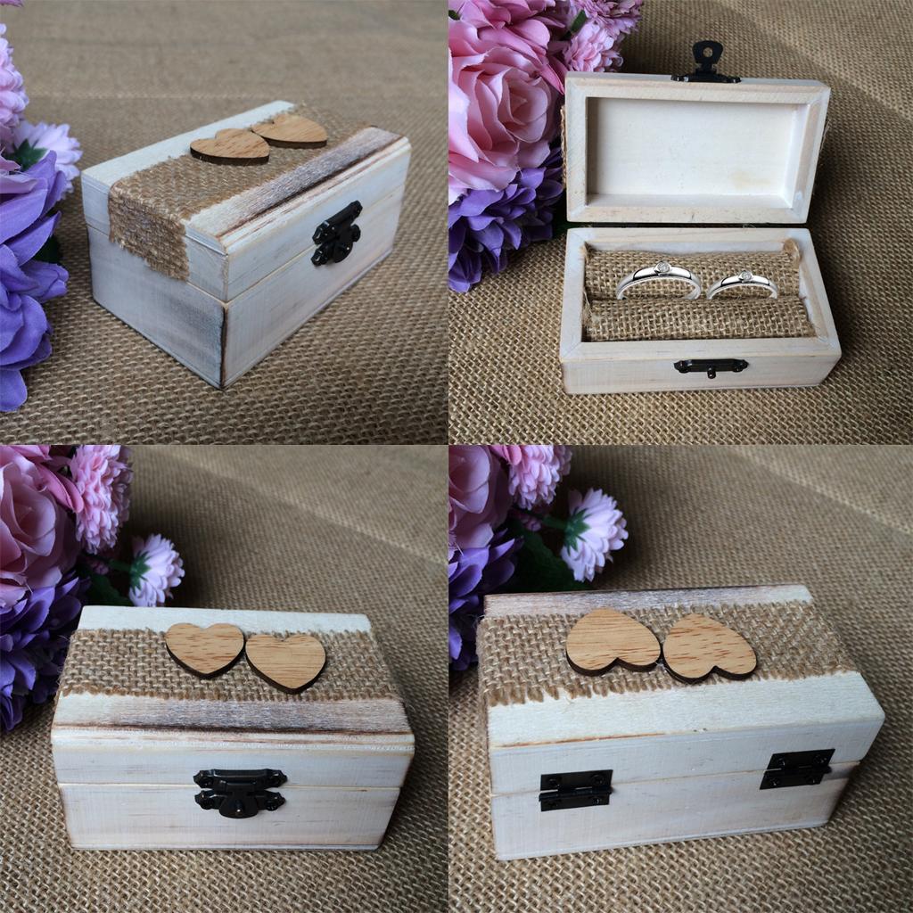 Adorned with wooden hearts and burlap ribbon on the cover and the removeable jute roll pillow inside box for holding rings.