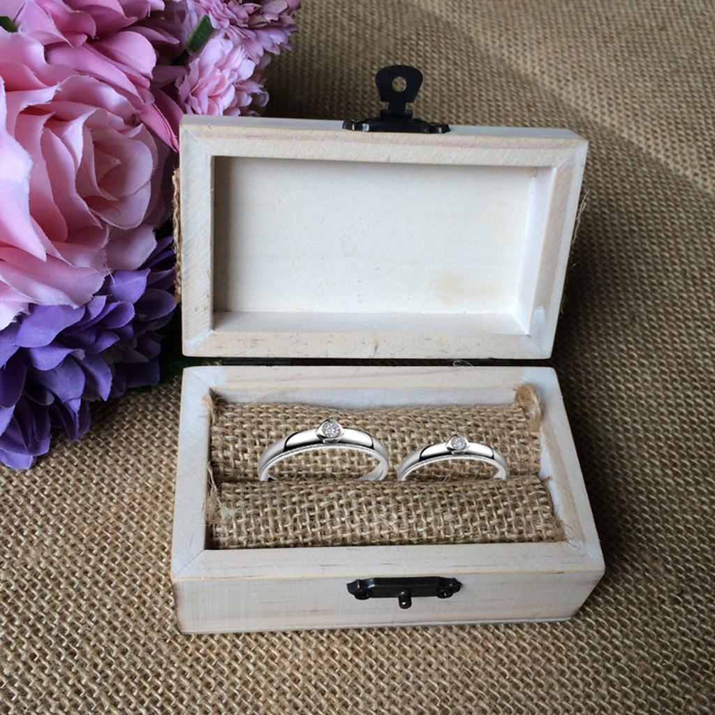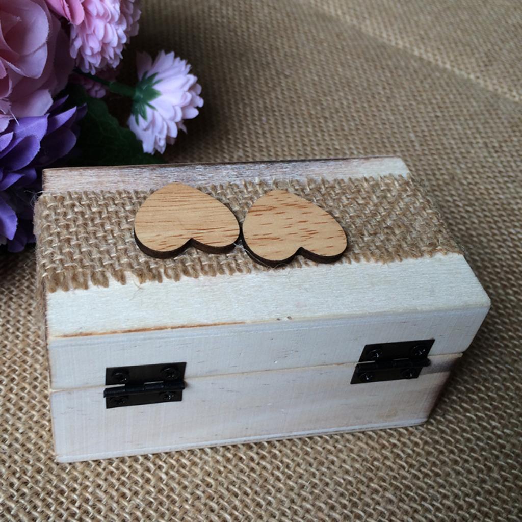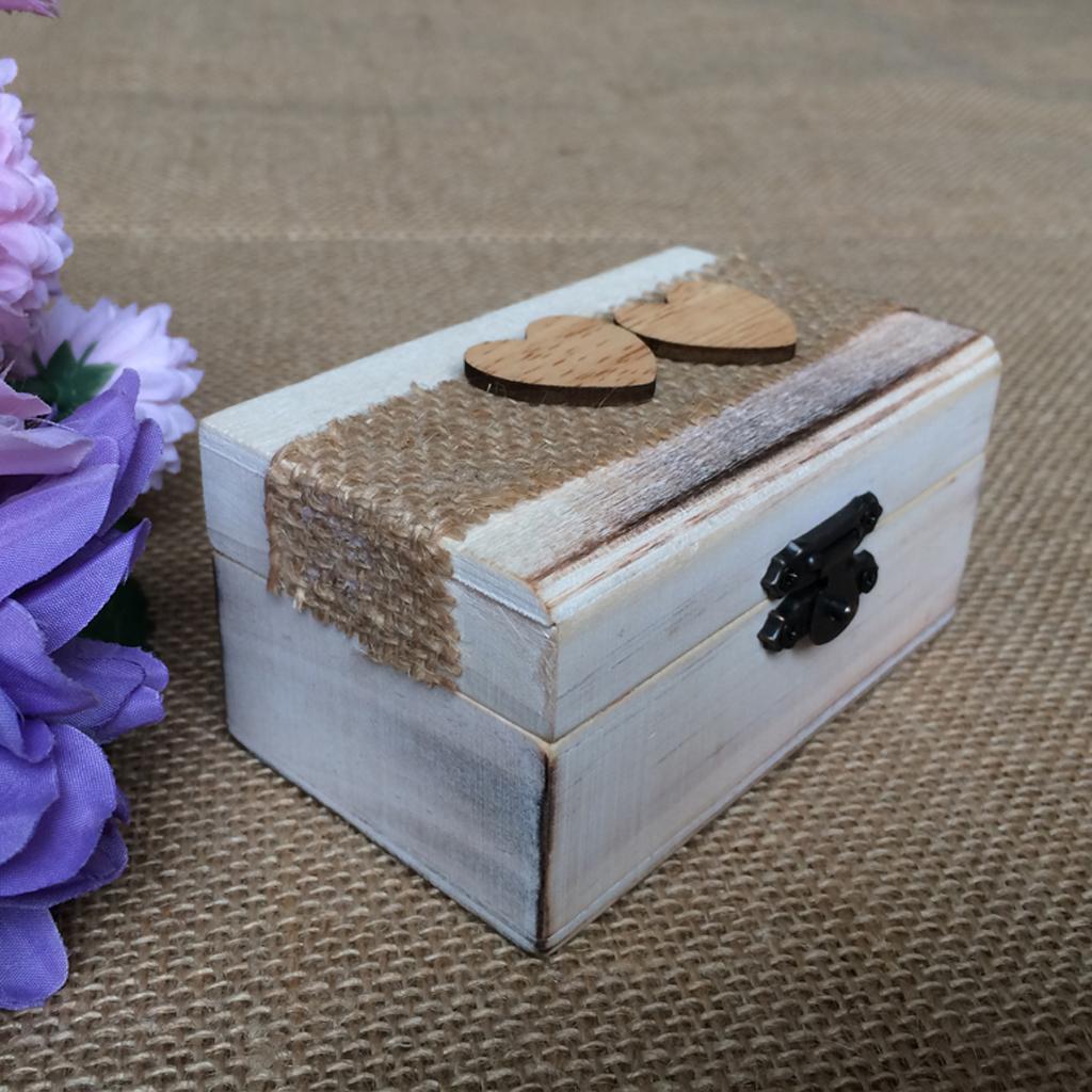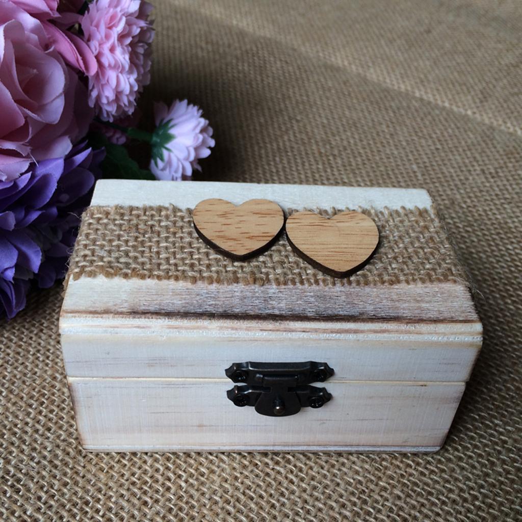 Adorned with wooden hearts and burlap ribbon on the cover and the removeable jute roll pillow inside box for holding rings.