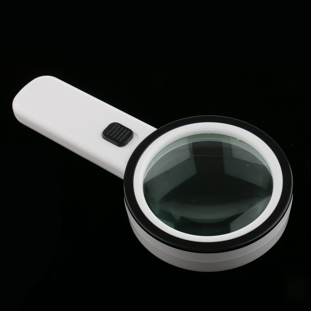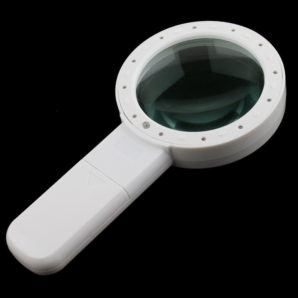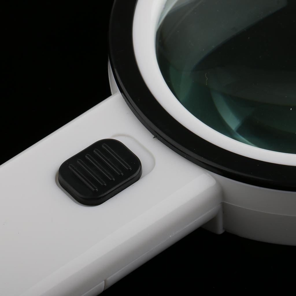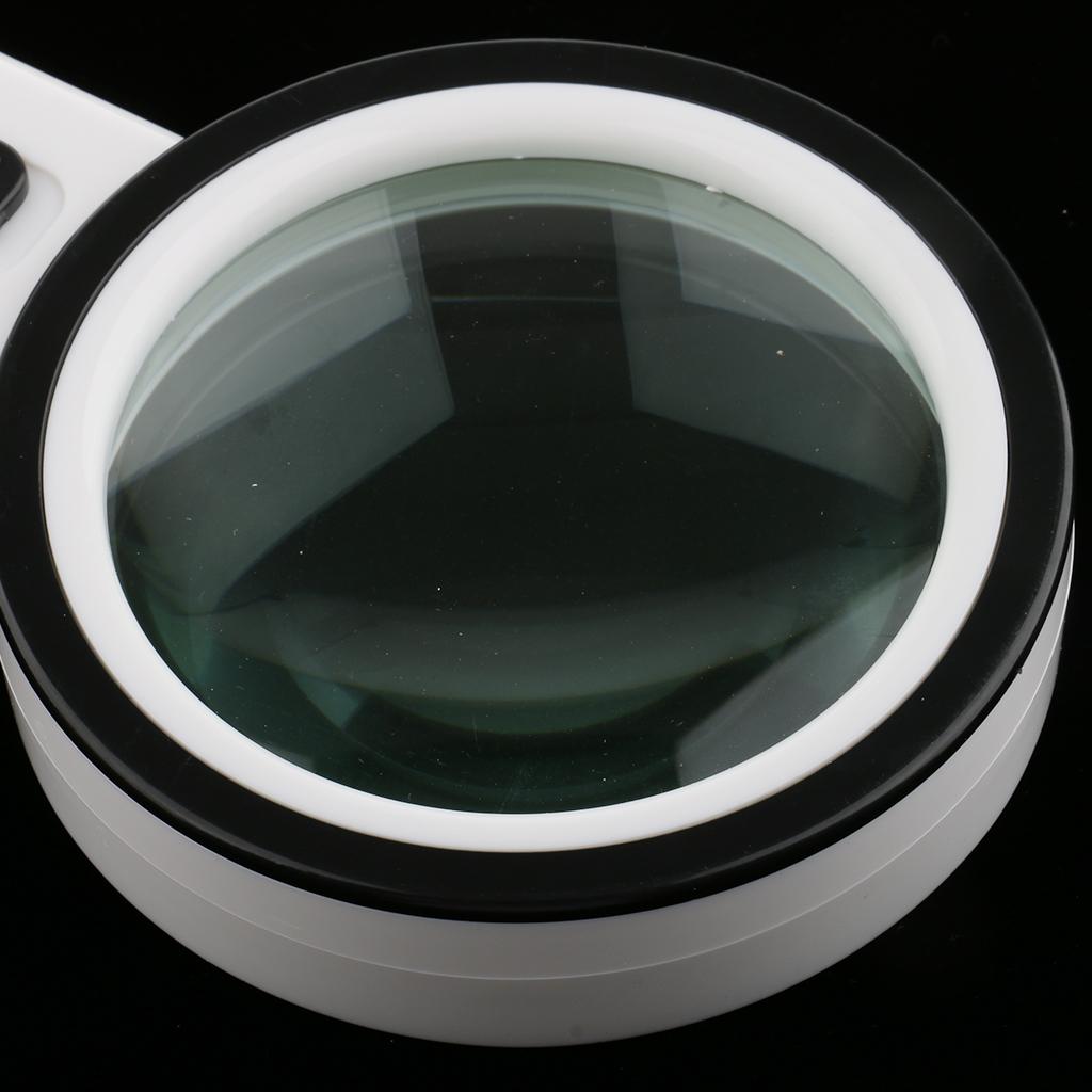 Equipped with 12 LED lights built in the handle with UV checking lamp. The lights are bright enough to illuminate text and objects under the magnifying window without being too harsh to the eyes.perfect for nighttime book reading and use in low light applications. The lights run on 2 AA batteries, which can last for a while.