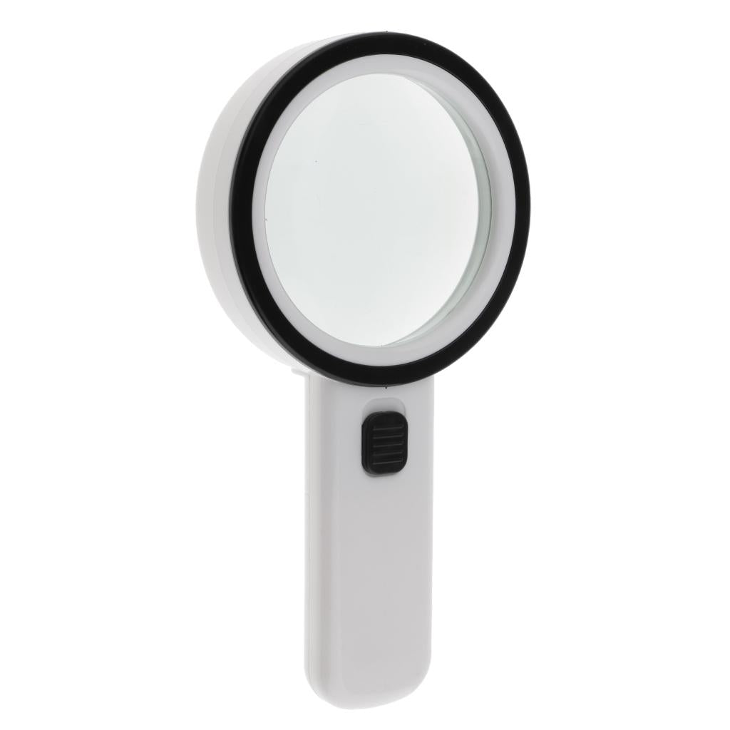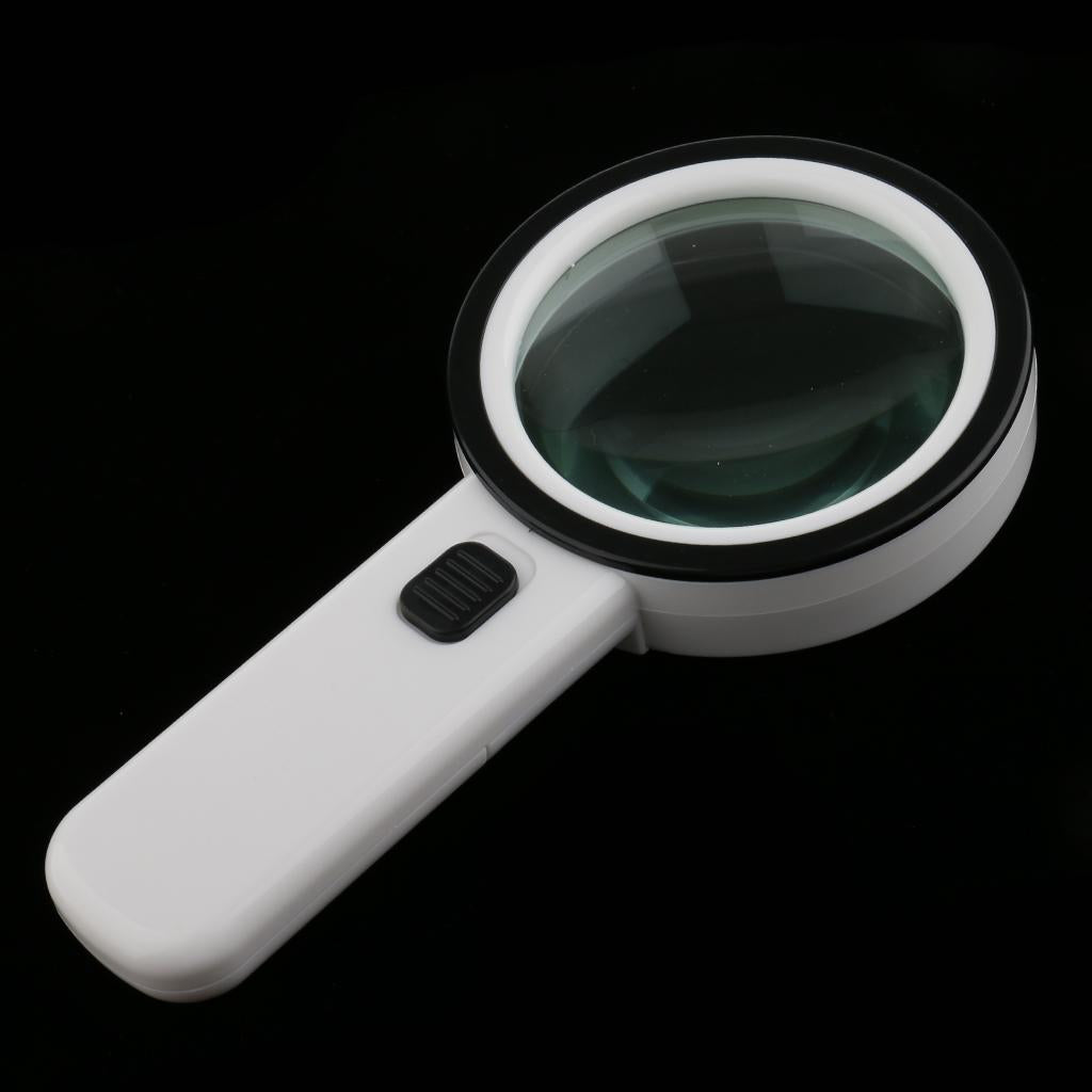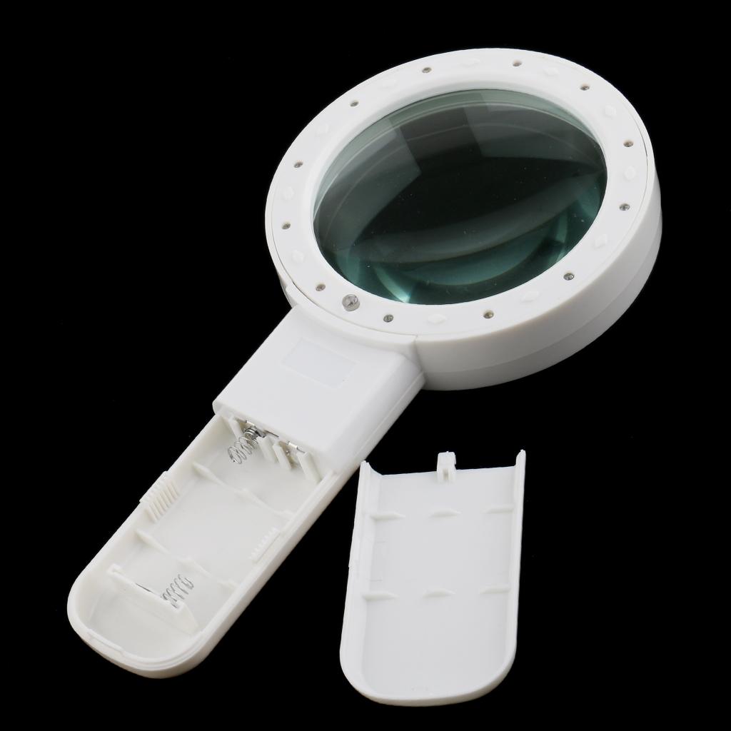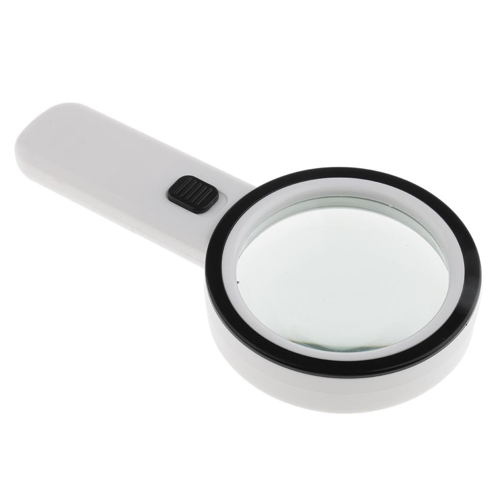 Equipped with 12 LED lights built in the handle with UV checking lamp. The lights are bright enough to illuminate text and objects under the magnifying window without being too harsh to the eyes.perfect for nighttime book reading and use in low light applications. The lights run on 2 AA batteries, which can last for a while.
