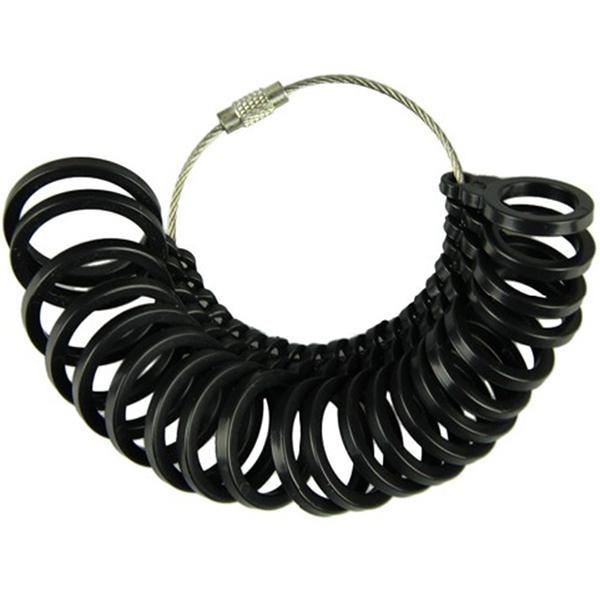 • This Finger Size Gauge for measuring ring sizes made of plastic with 11 different size rings all are held together on ball chain link