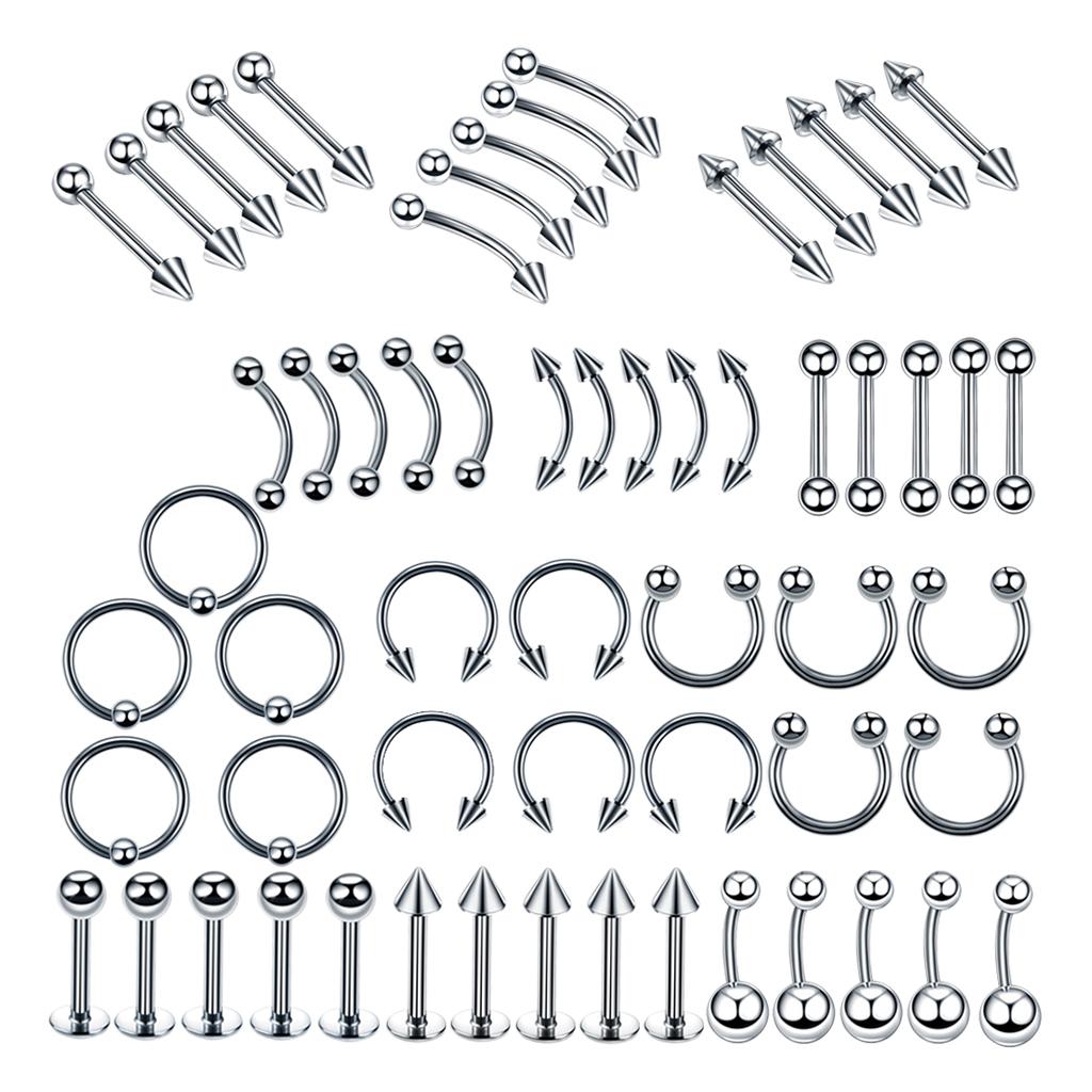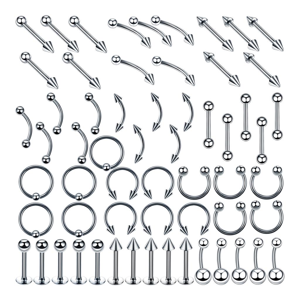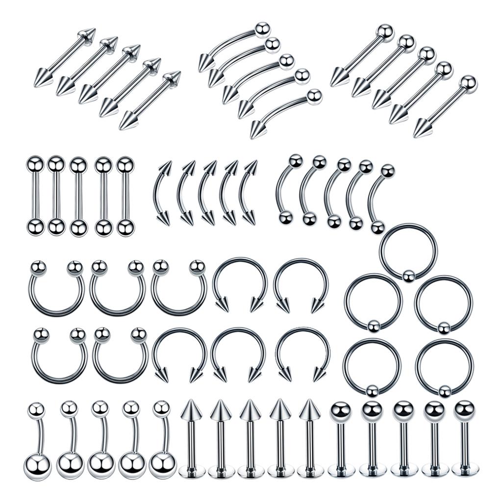 60 Pierces Body Piercing Lot,Belly Button Ring,Labret Piercing,Tongue Ring,Hoop Nose Ring,Horseshoe Ring,Eyebrow Piercing, Tragus Piercing Earring.