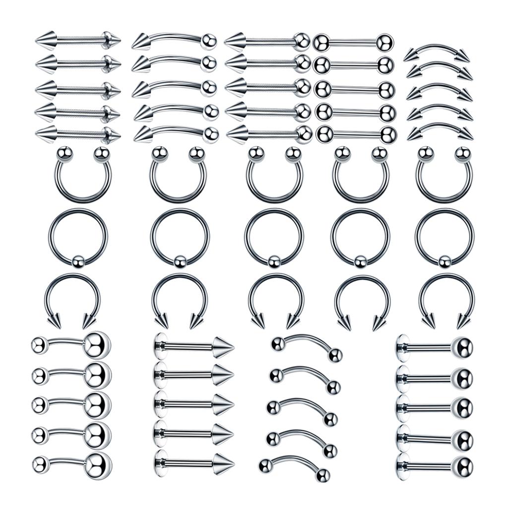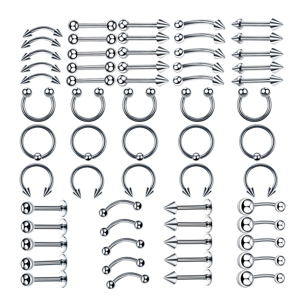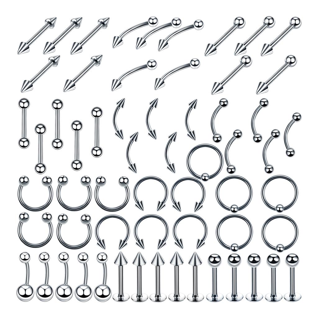 60 Pierces Body Piercing Lot,Belly Button Ring,Labret Piercing,Tongue Ring,Hoop Nose Ring,Horseshoe Ring,Eyebrow Piercing, Tragus Piercing Earring.