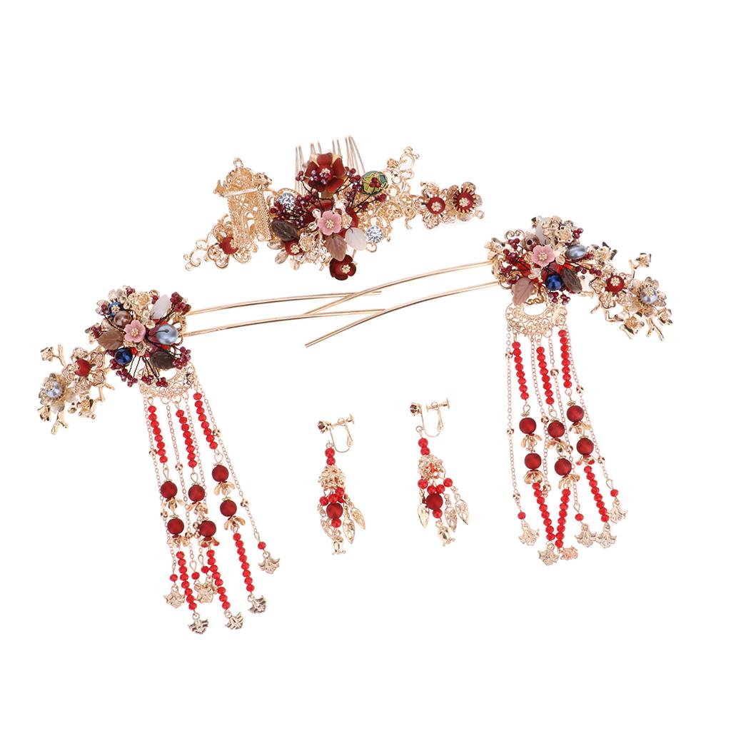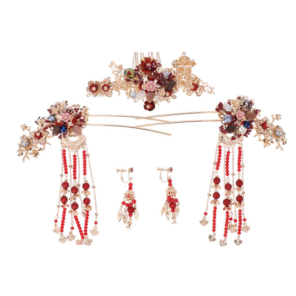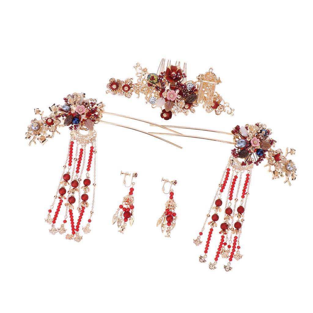 Luxury gold tone hair comb hair stick and dangle earrings set, traditional chinese wedding bridal hair accessory