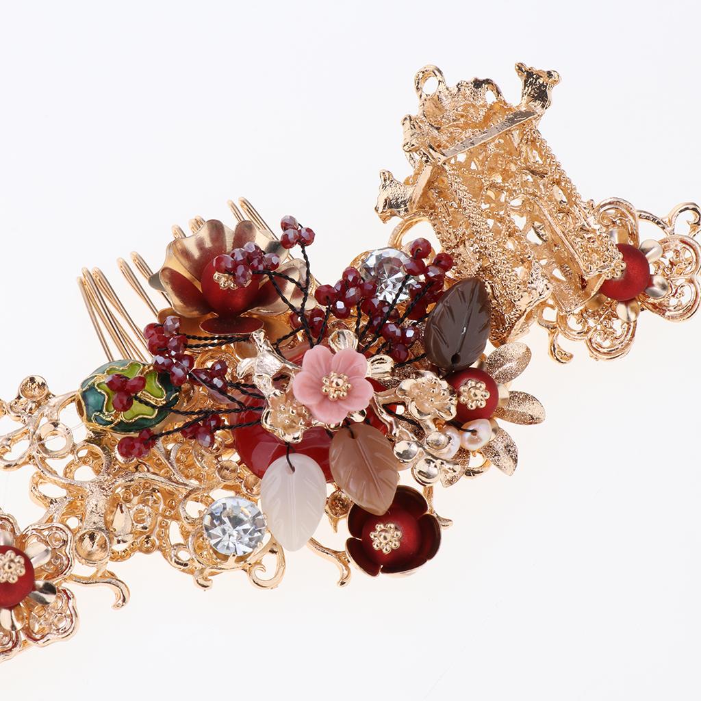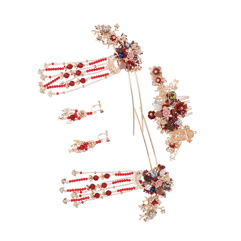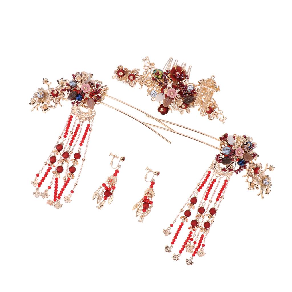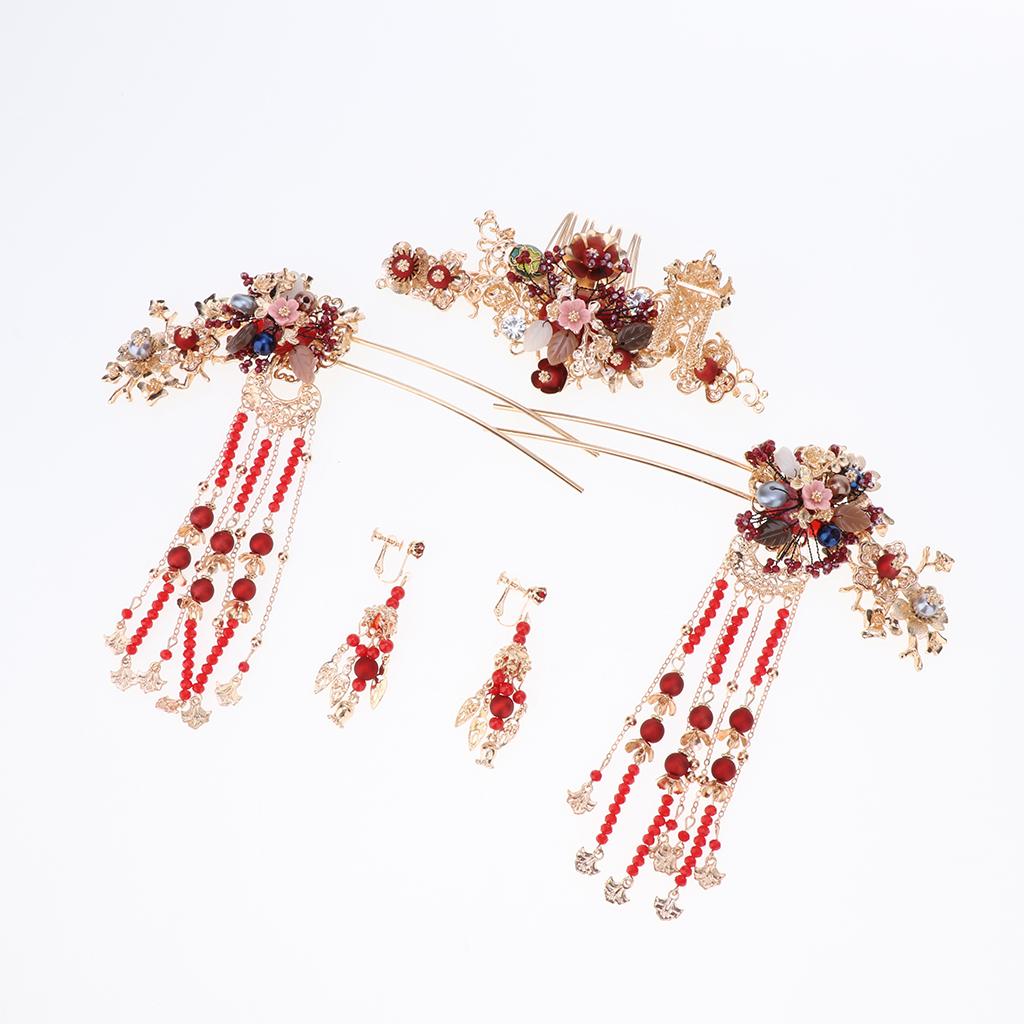 Luxury gold tone hair comb hair stick and dangle earrings set, traditional chinese wedding bridal hair accessory