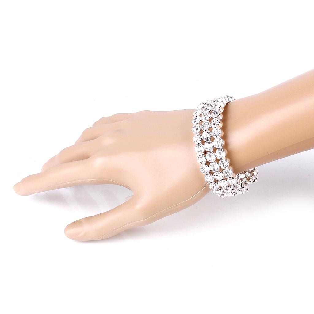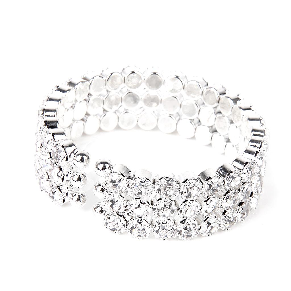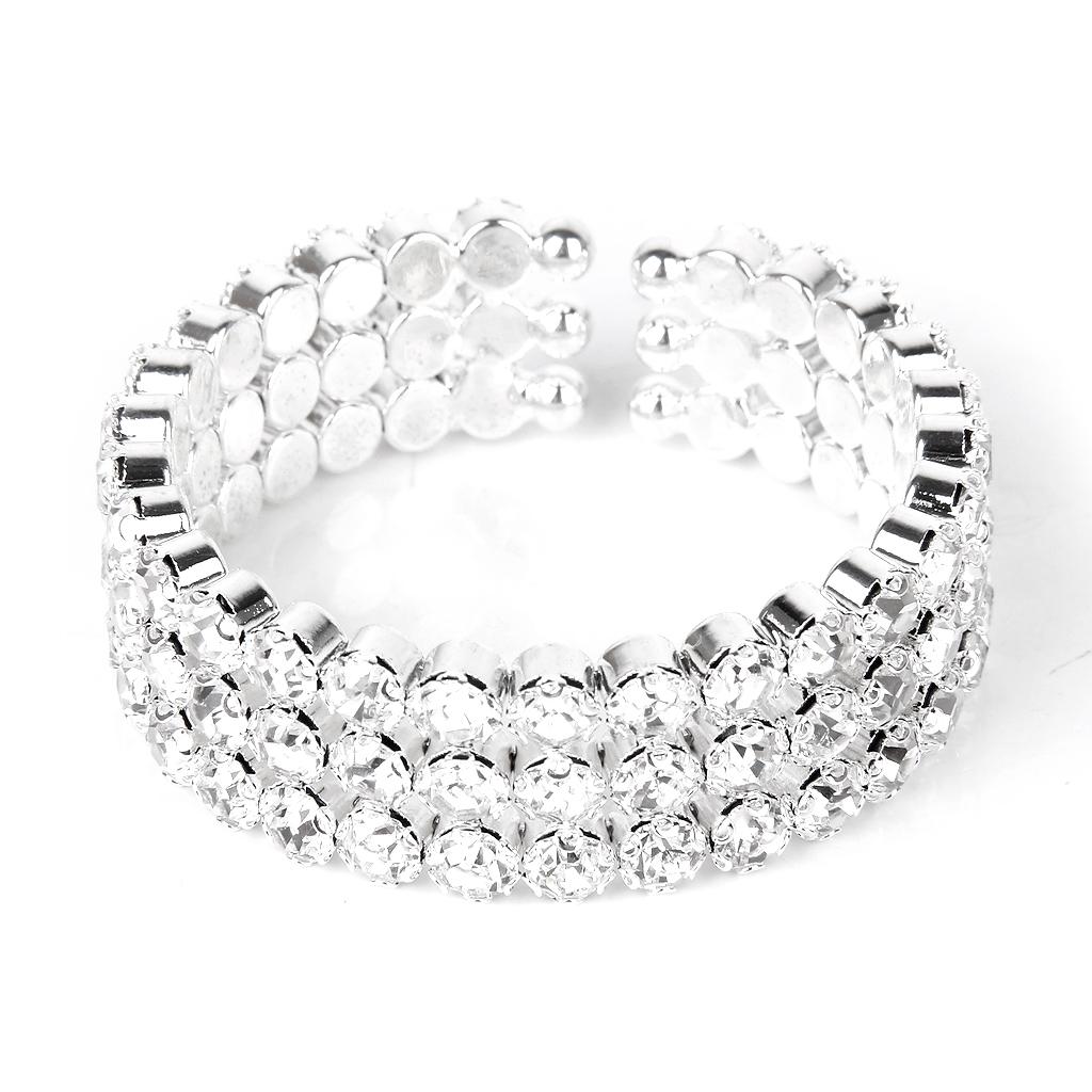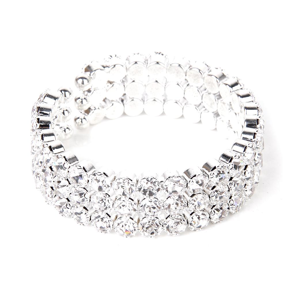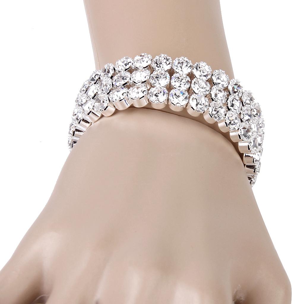 Clear Silver Wedding Bridal 3-Row Crystal Rhinestone Open Cuff Bracelet Wristband