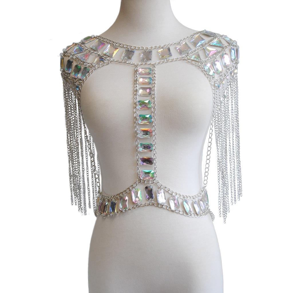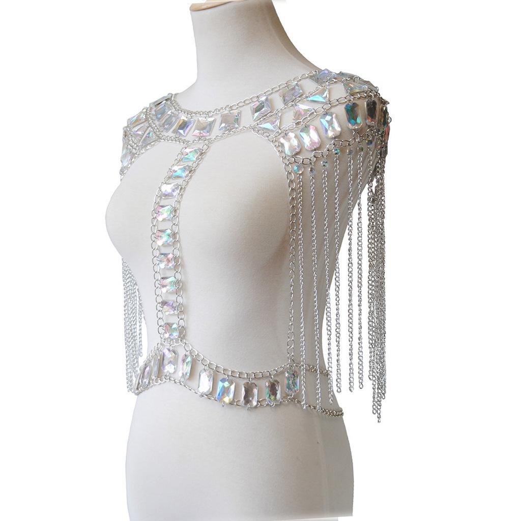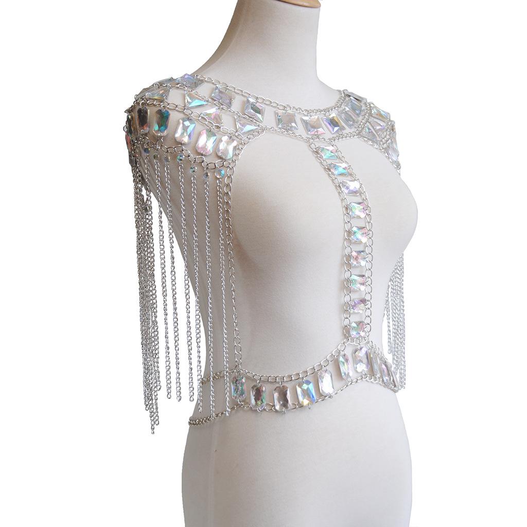 Fashionable unique long tassel Crystal Shoulder necklace Chest Harness Bikini Body Chain jewelry ,Great for Cocktail Nightclub show jewelry costmues accessories