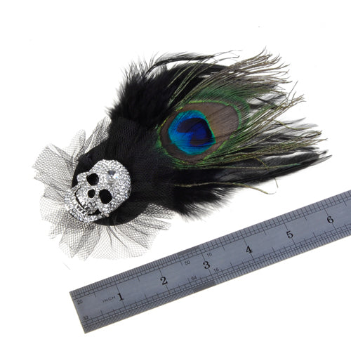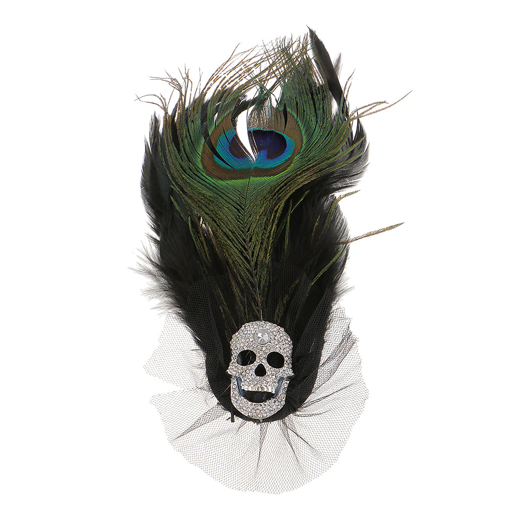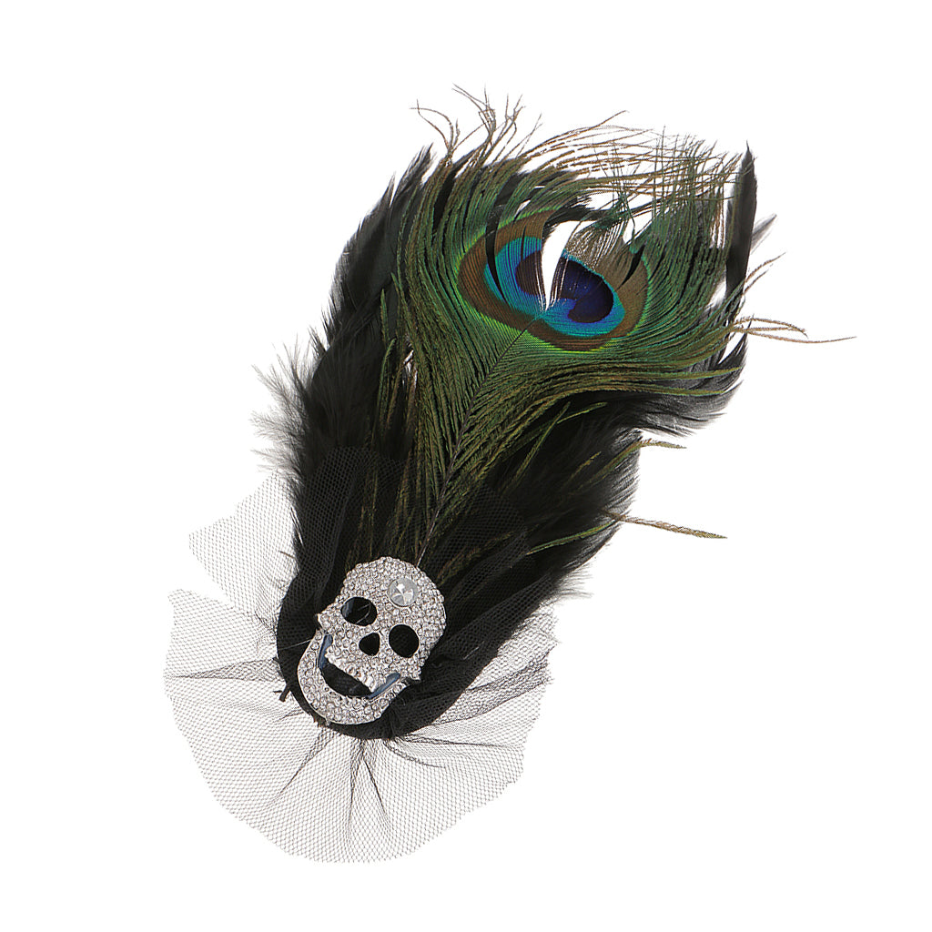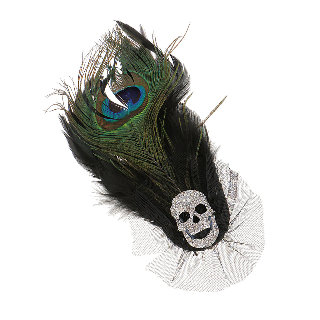 Keywords: Brooch, peacock feather, rhinestone, skull, safety pin, alligator clip, silver-toned