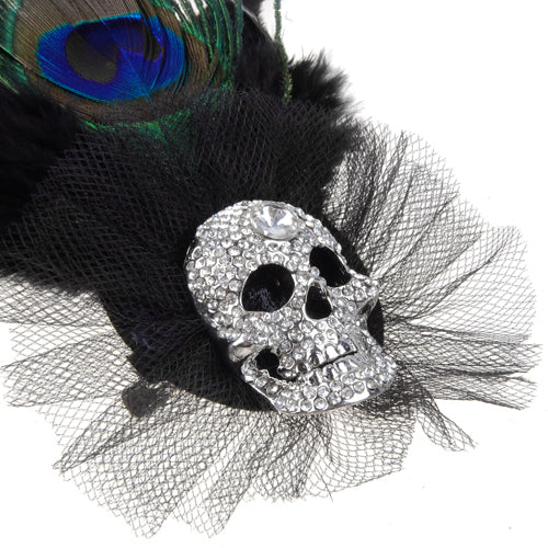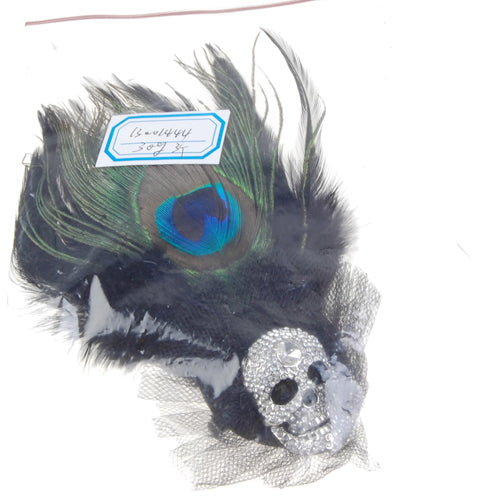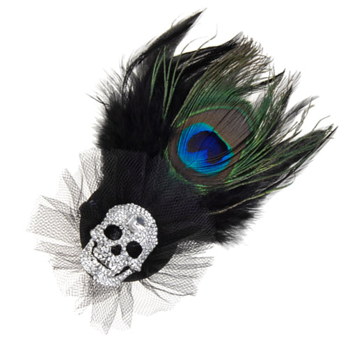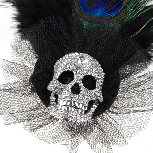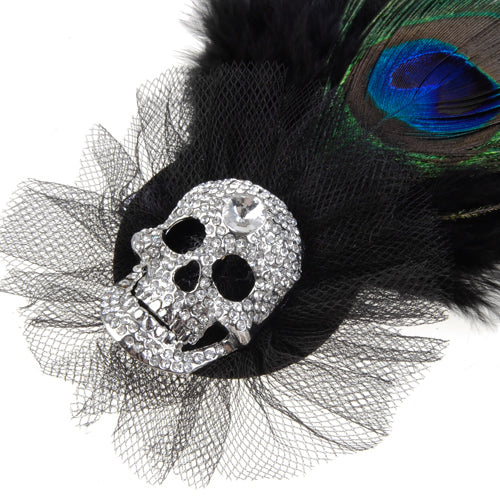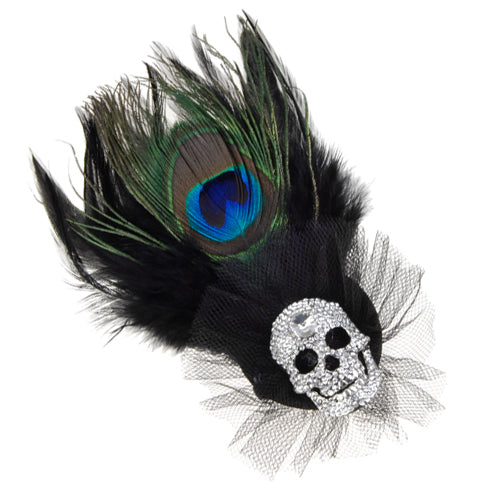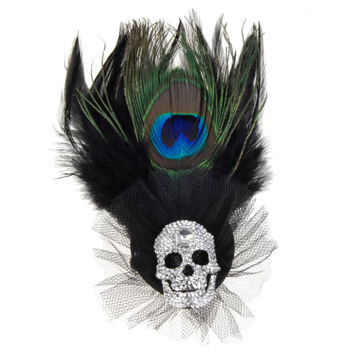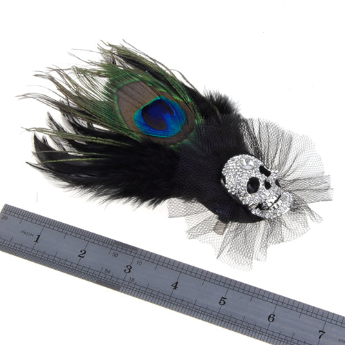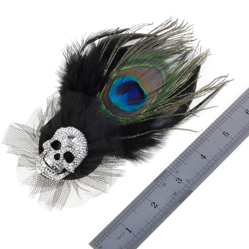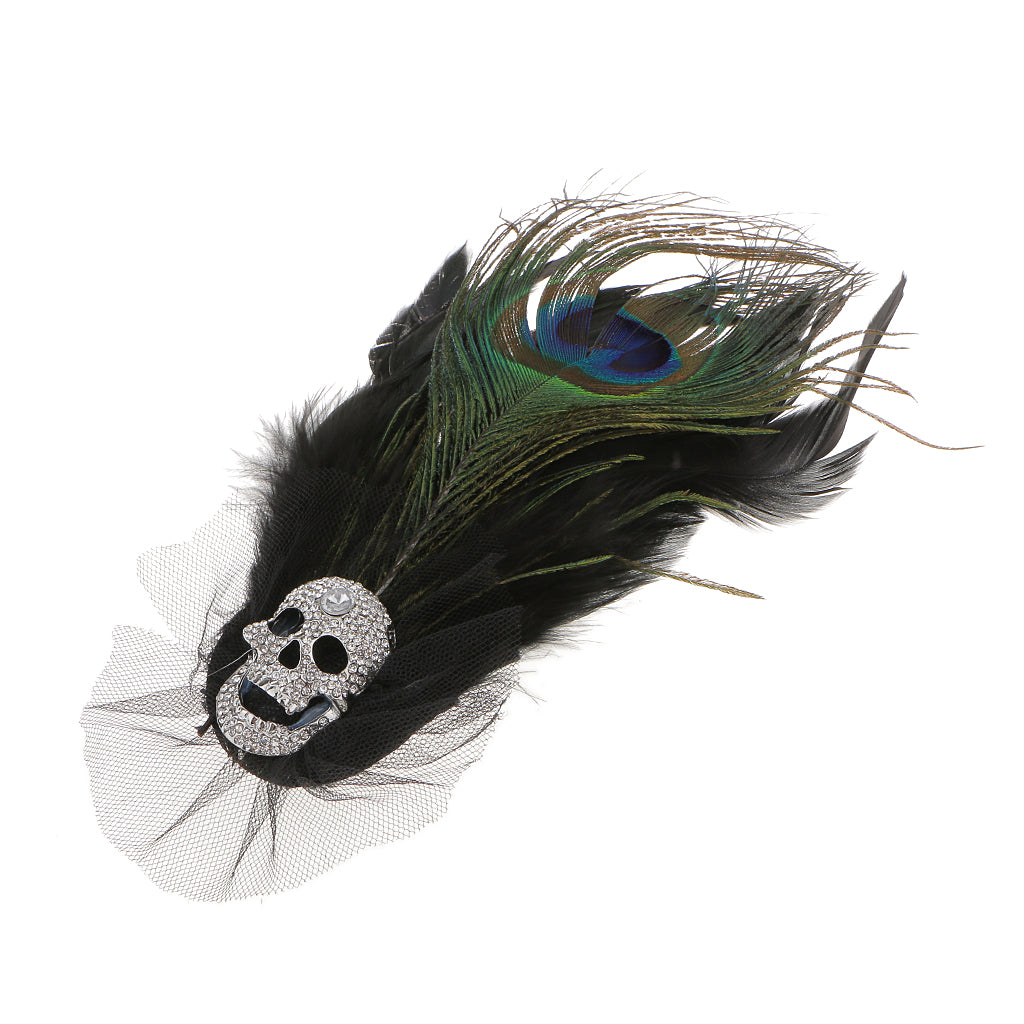 Keywords: Brooch, peacock feather, rhinestone, skull, safety pin, alligator clip, silver-toned