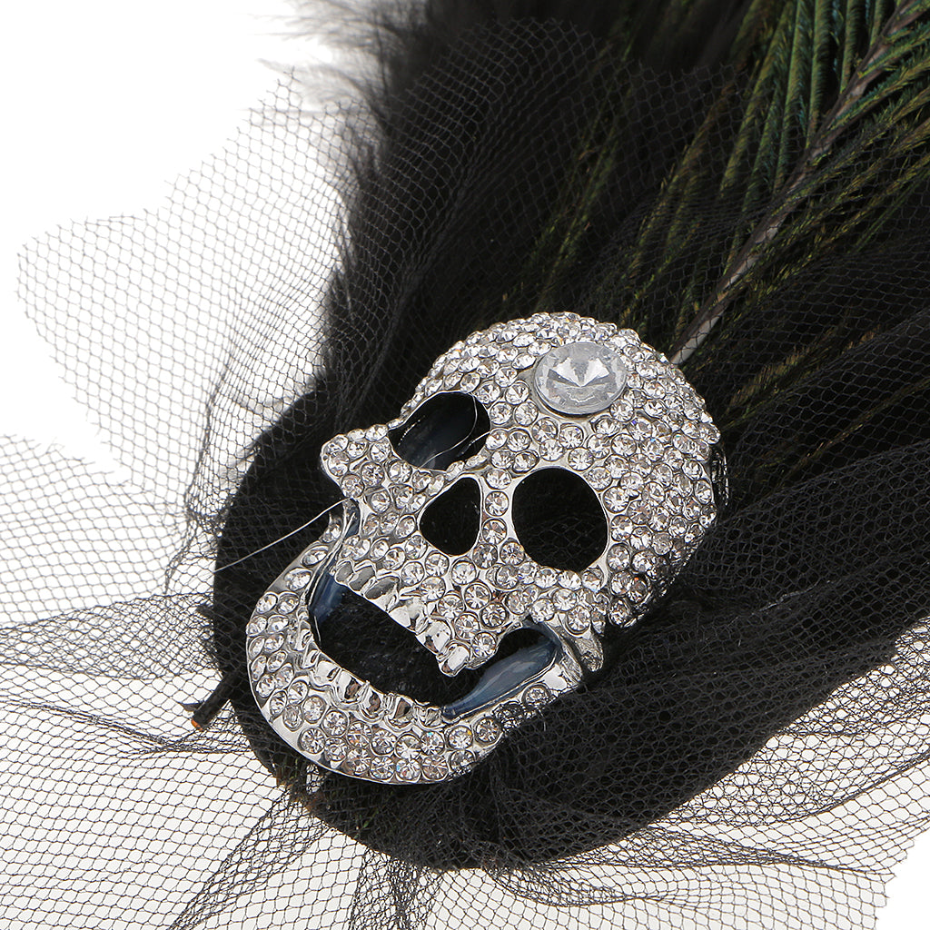 This luxurious and stylish brooch features long feathers and a dazzling alloy skull which is fully adorned with white rhinestones. It would add a special taste to your Hippie or other groovy costume.