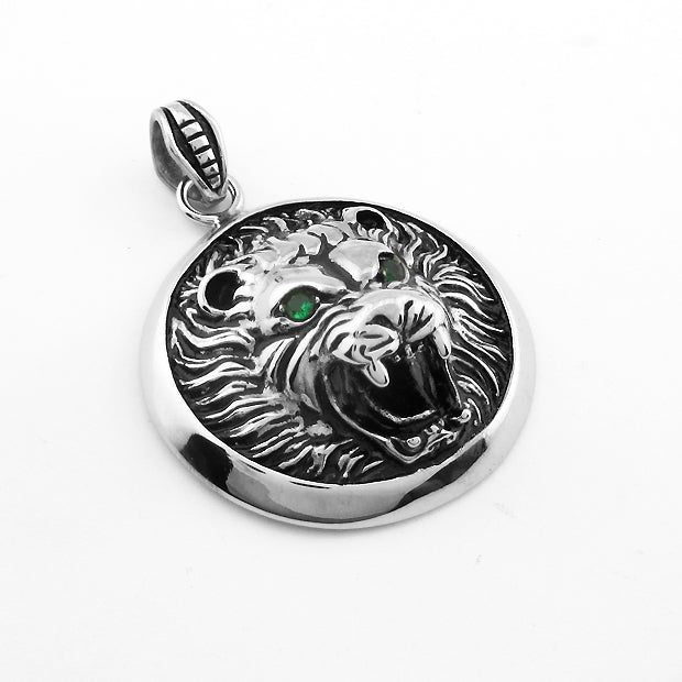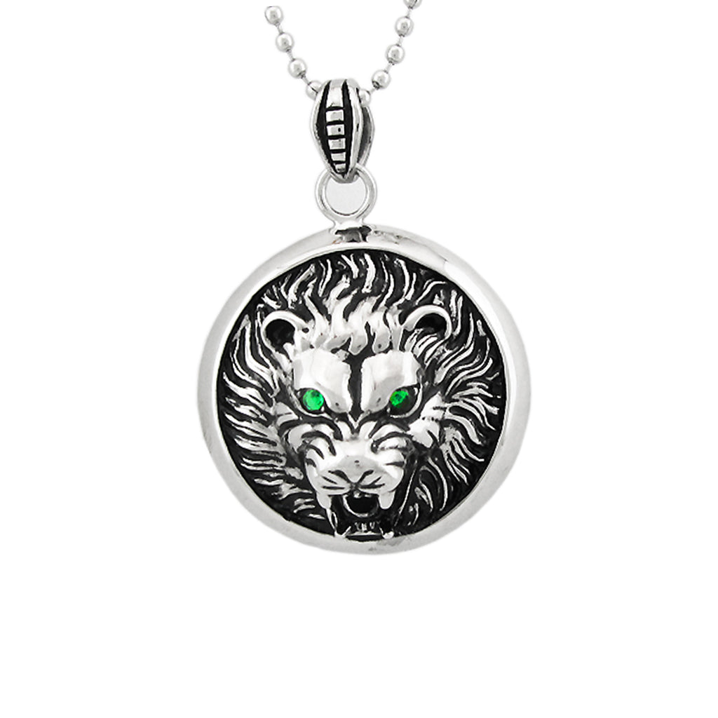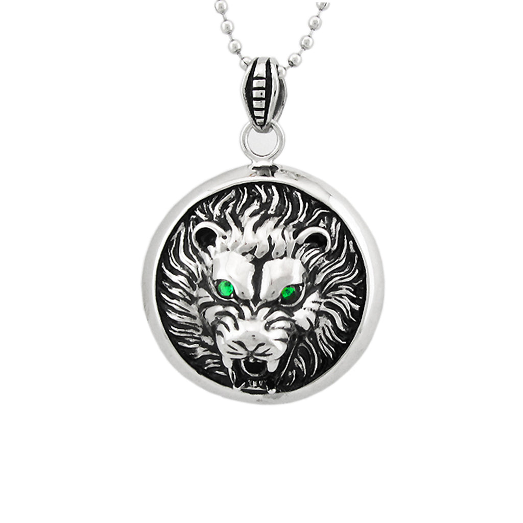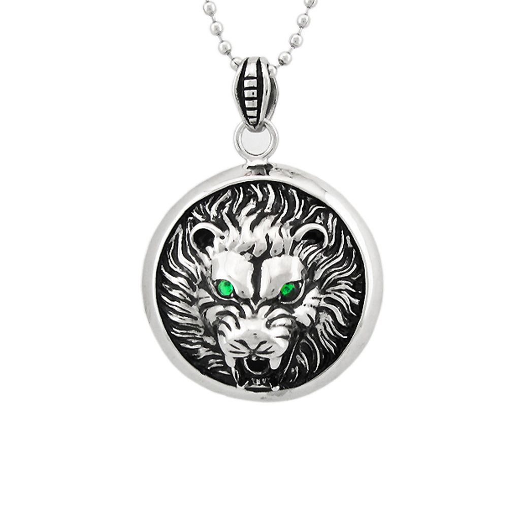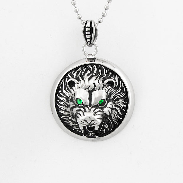 Punk Casting Round 3D Lion Head Green Rhinestone Pendant Necklace Halloween