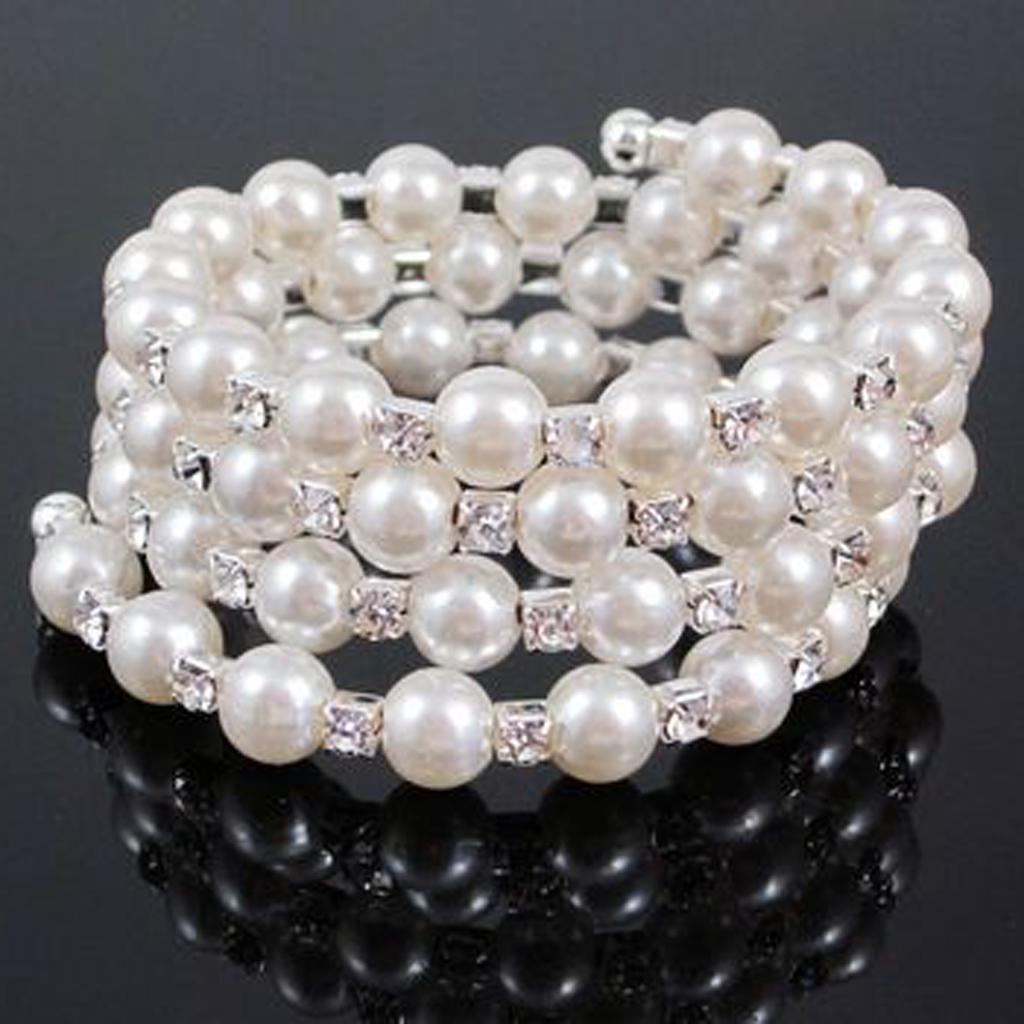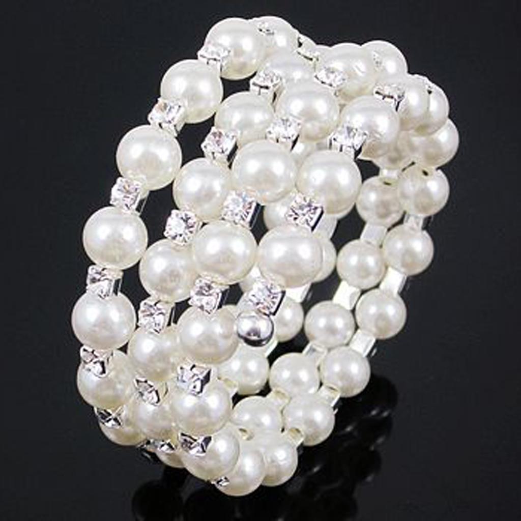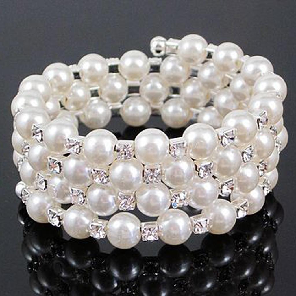 Wedding Bridal Jewelry 4 Row Pearl Crystal Rhinestone Bangle Bracelet