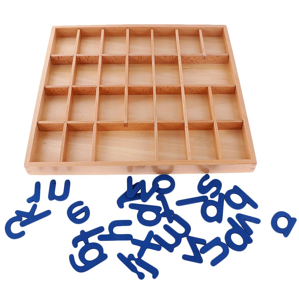 A box which has 26 small wooden compartments, and a pack of 26 letters, a-z