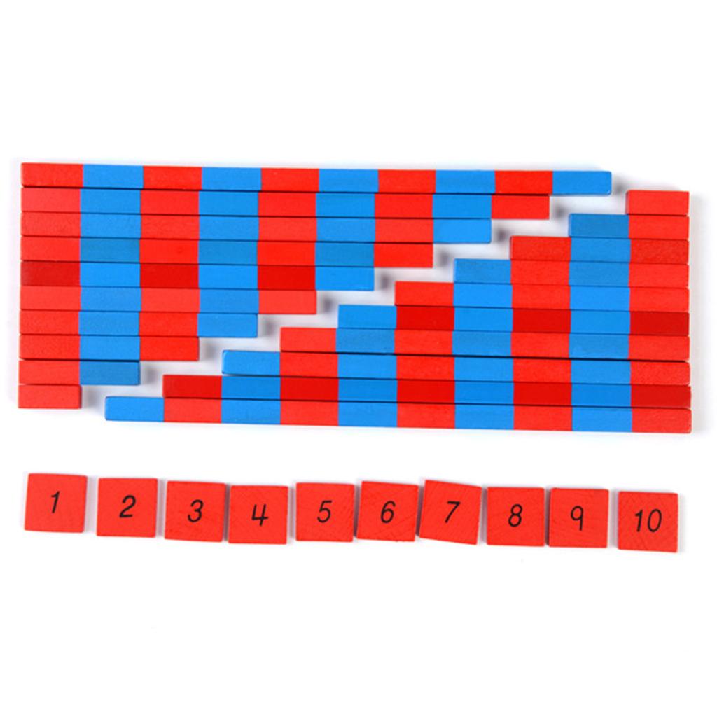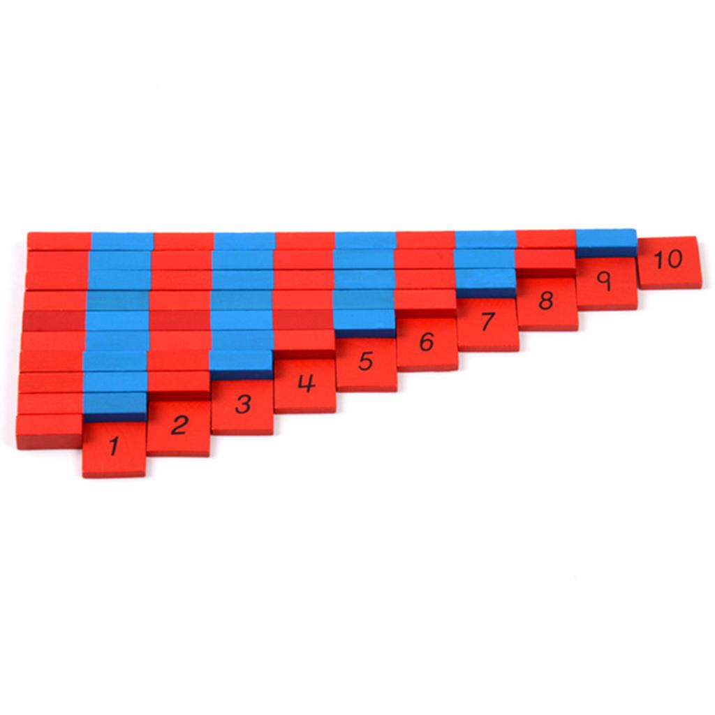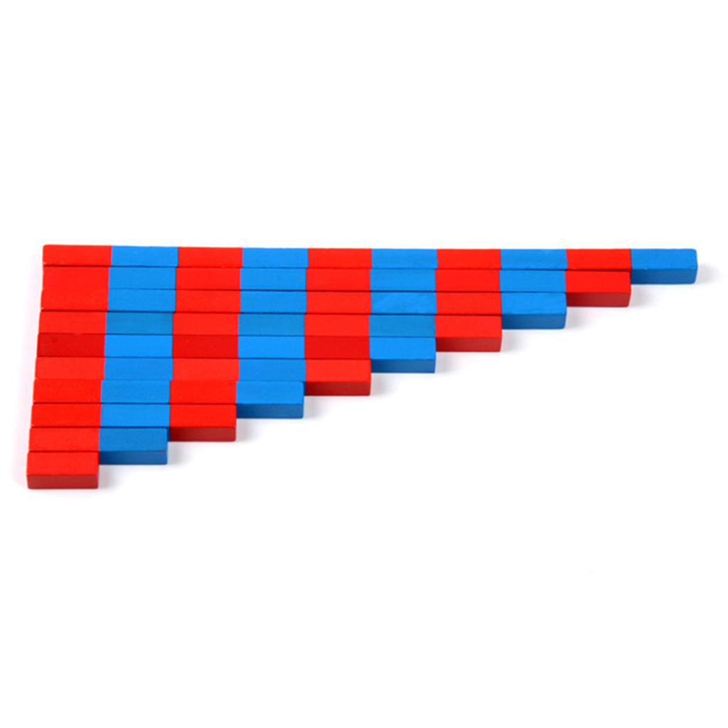 Ten wooden rods in graded lengths, 2.5x1x1cm, painted red and blue in alternate segments. The number of segments in each rod represents the number of the rod