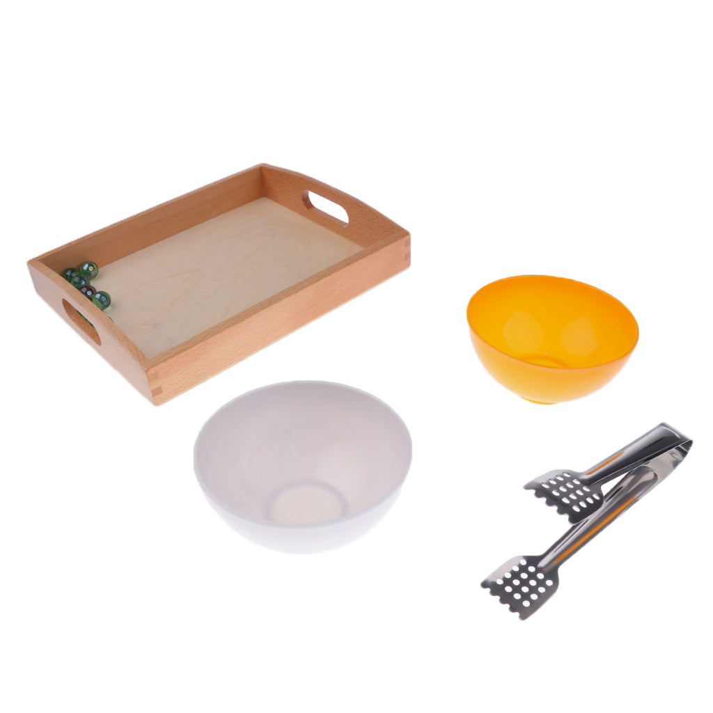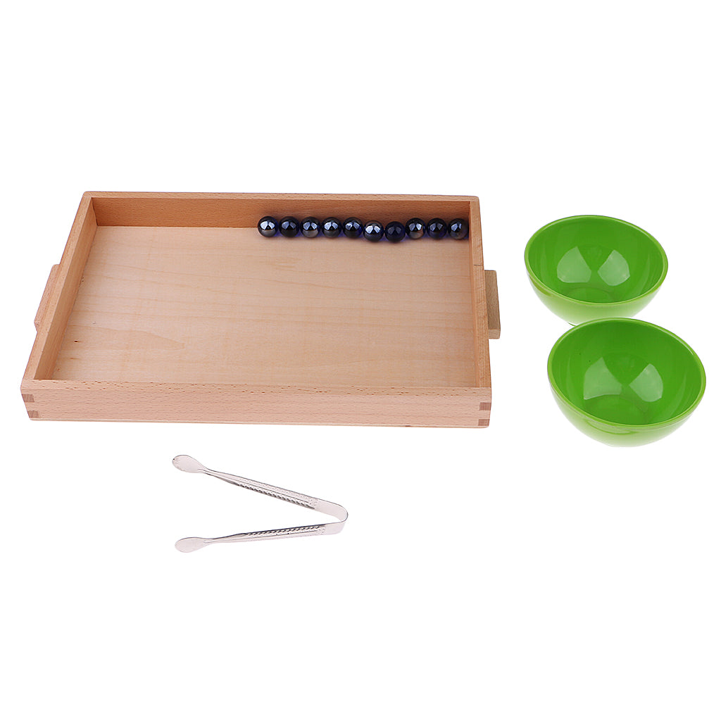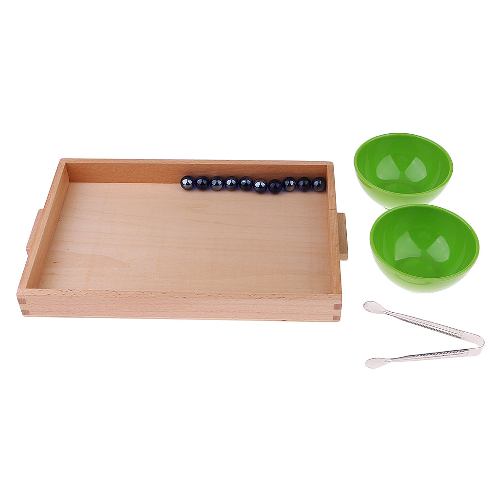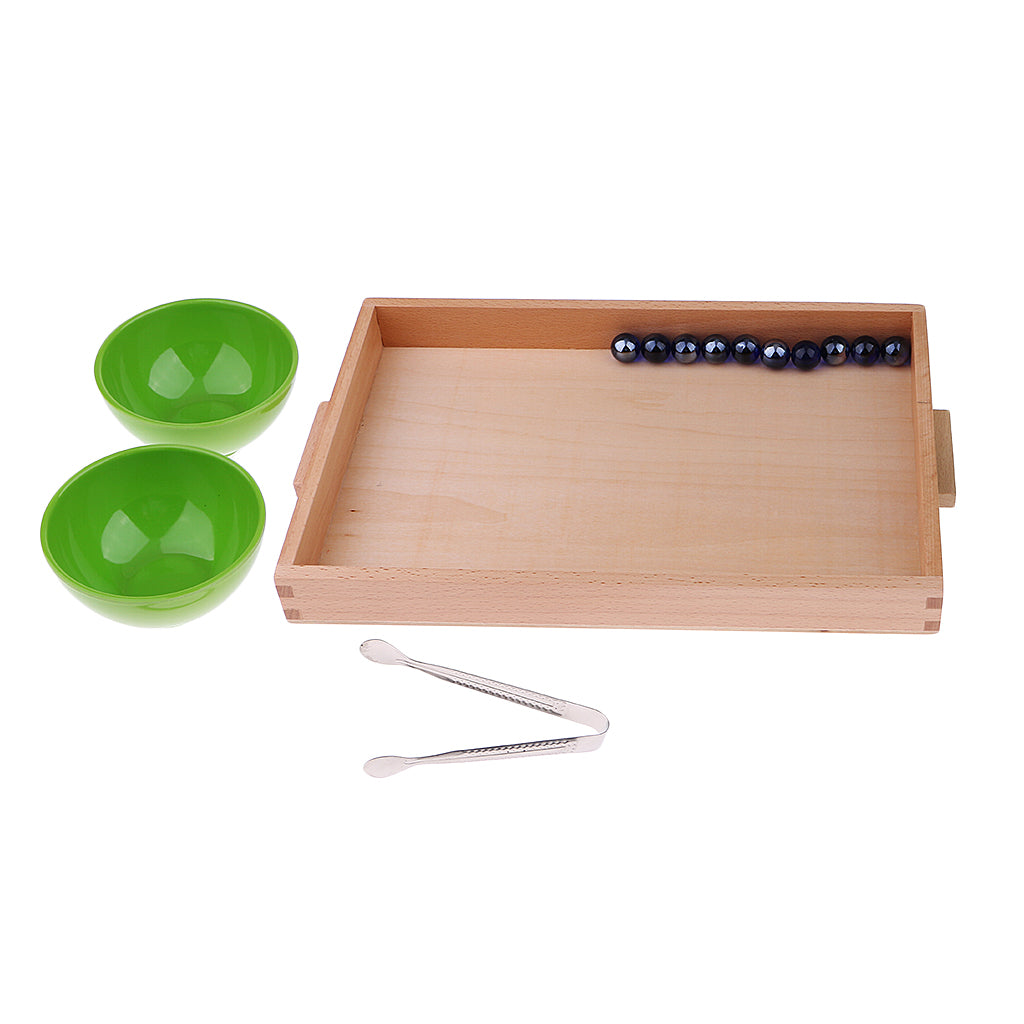 Set includes 1 wooden tray, 1 stainless steel tong, 2 green cups and 10 beads.