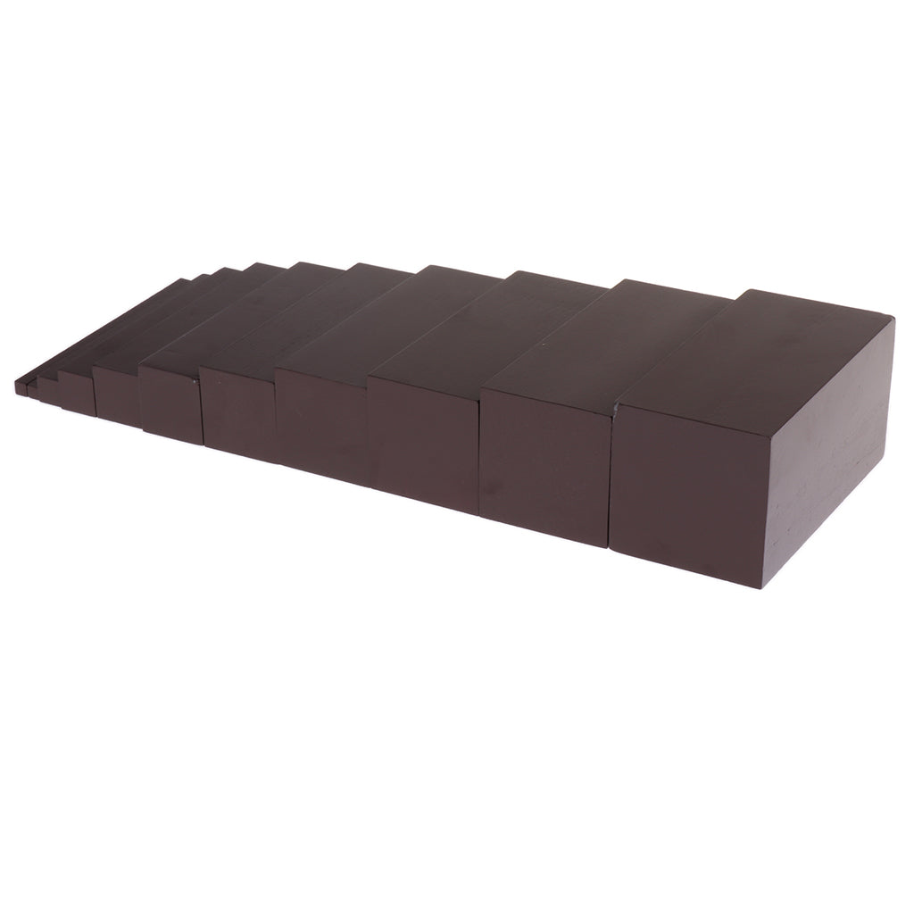 • This material consists of 10 brown wooden prisms or blocks that vary in height and width and can be arranged in order from smallest to largest to form a stair. The prisms are all of the same length but the width and height ranges from 0.7cm to 7cm