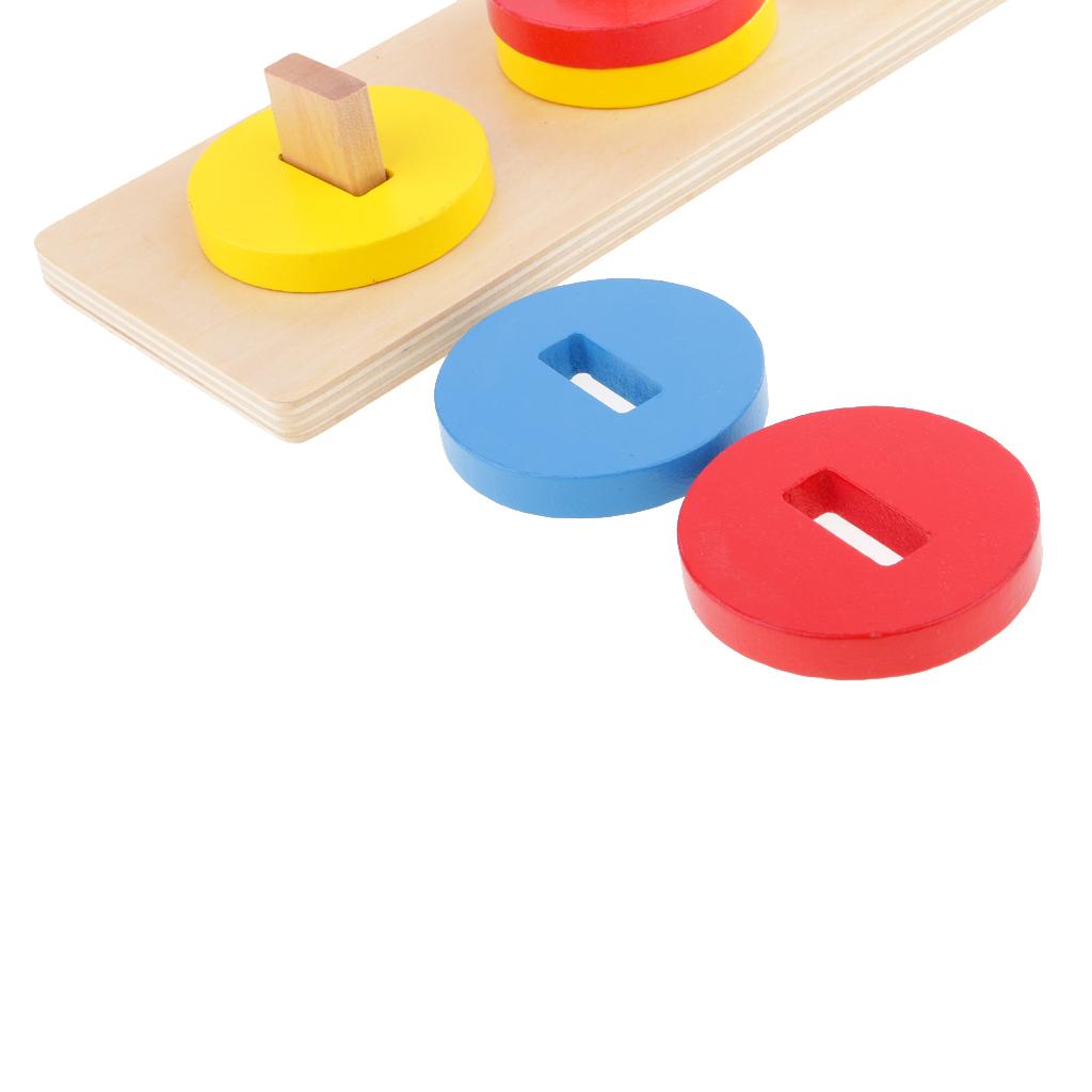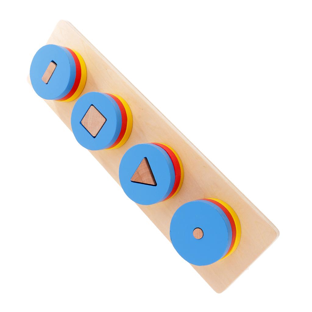 There are 4pcs different shape tower ring(Rectangle, Square, Triangle, Round); 4 sets different geometric core shape and colors(Blue, Red, Yellow) circle boards