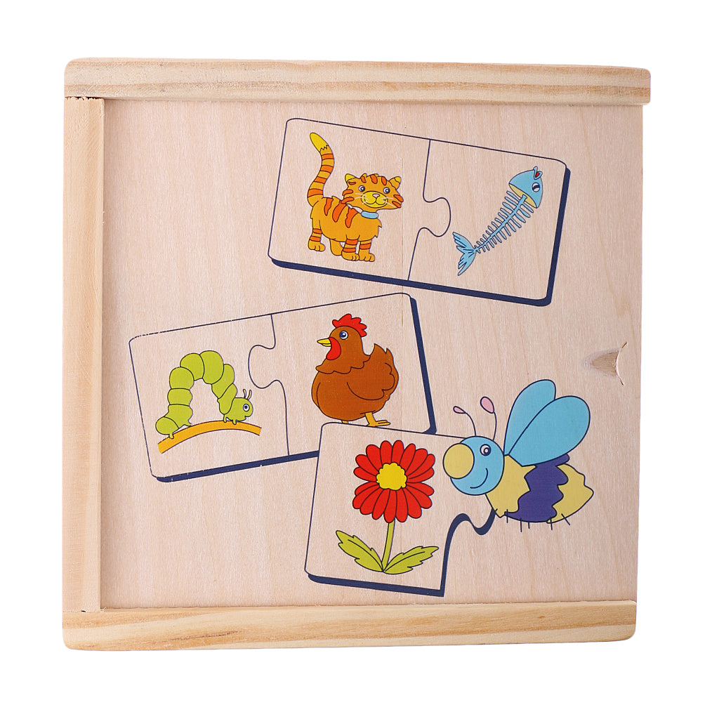 Chicken and bug, dog and bone, rabbit and carrot, bee and flower, horse and grass, lion and meat, cat and fish, mouse and bread, sheep and grass, monkey and banana