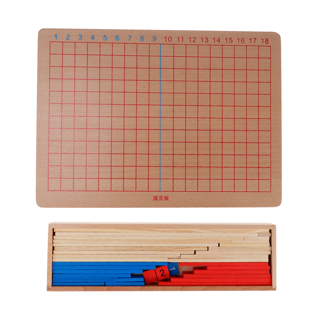 • Include 1 addtion and subtration board, one side addition(with blue squares), one side subtraction(with red squares). Both side draws 12 squares by 18 squares with numbers 1-18 printed on the top. One box of 9 blue strips, 9 red strips and 18 natural wood strips