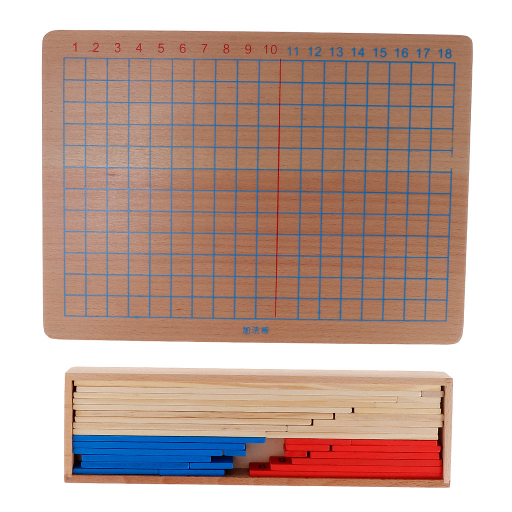 Include 1 addtion and subtration board, one side addition(with blue squares), one side subtraction(with red squares). Both side draws 12 squares by 18 squares with numbers 1-18 printed on the top. One box of 9 blue strips, 9 red strips and 18 natural wood strips