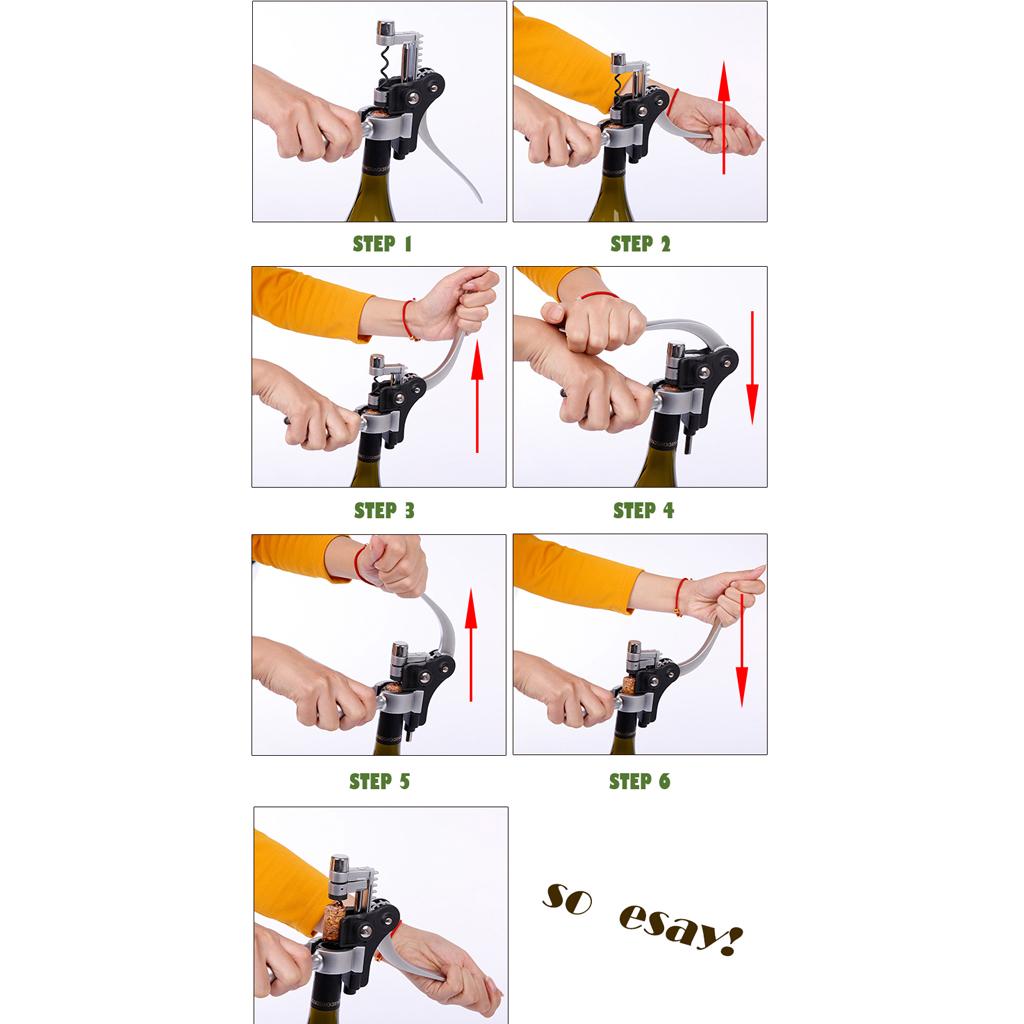 Package includes corkscrew/bottle opener, drip ring, stopper, 2 foil cutter, wine pourer/stopper, 2 spare bits