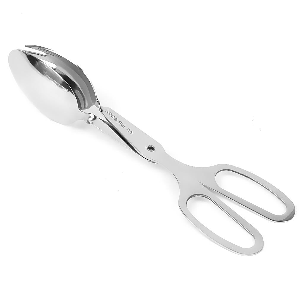 Sleek stainless steel salad tongs feature a durable fork and spoon combination and large, comfortable loop handles. The salad tongs is also can be used while cooking to grab and turn hot foods.
