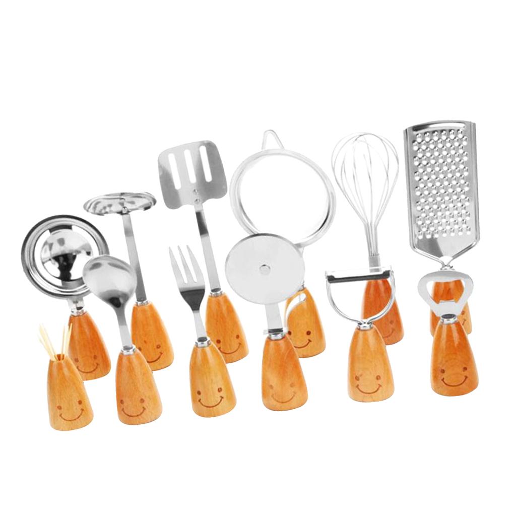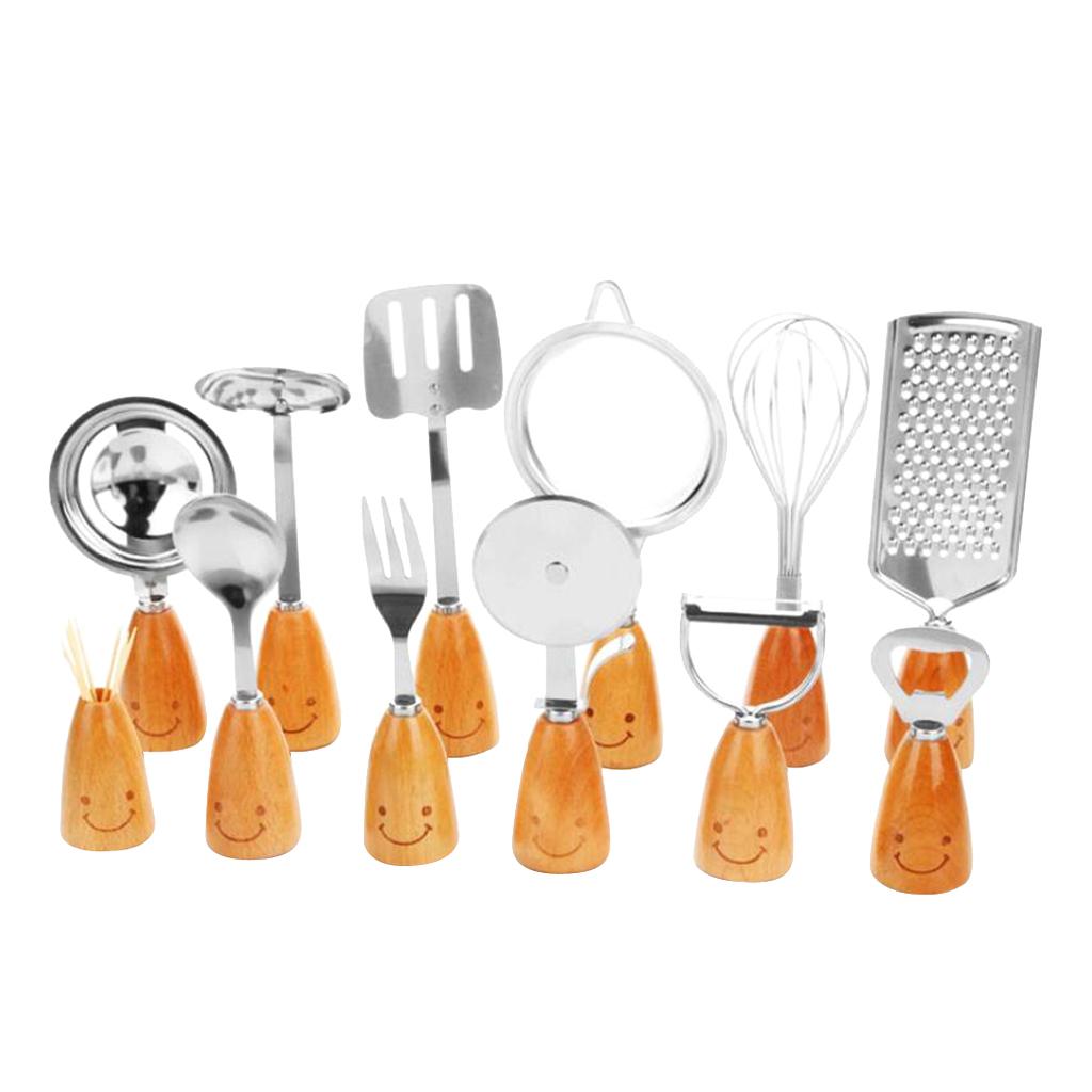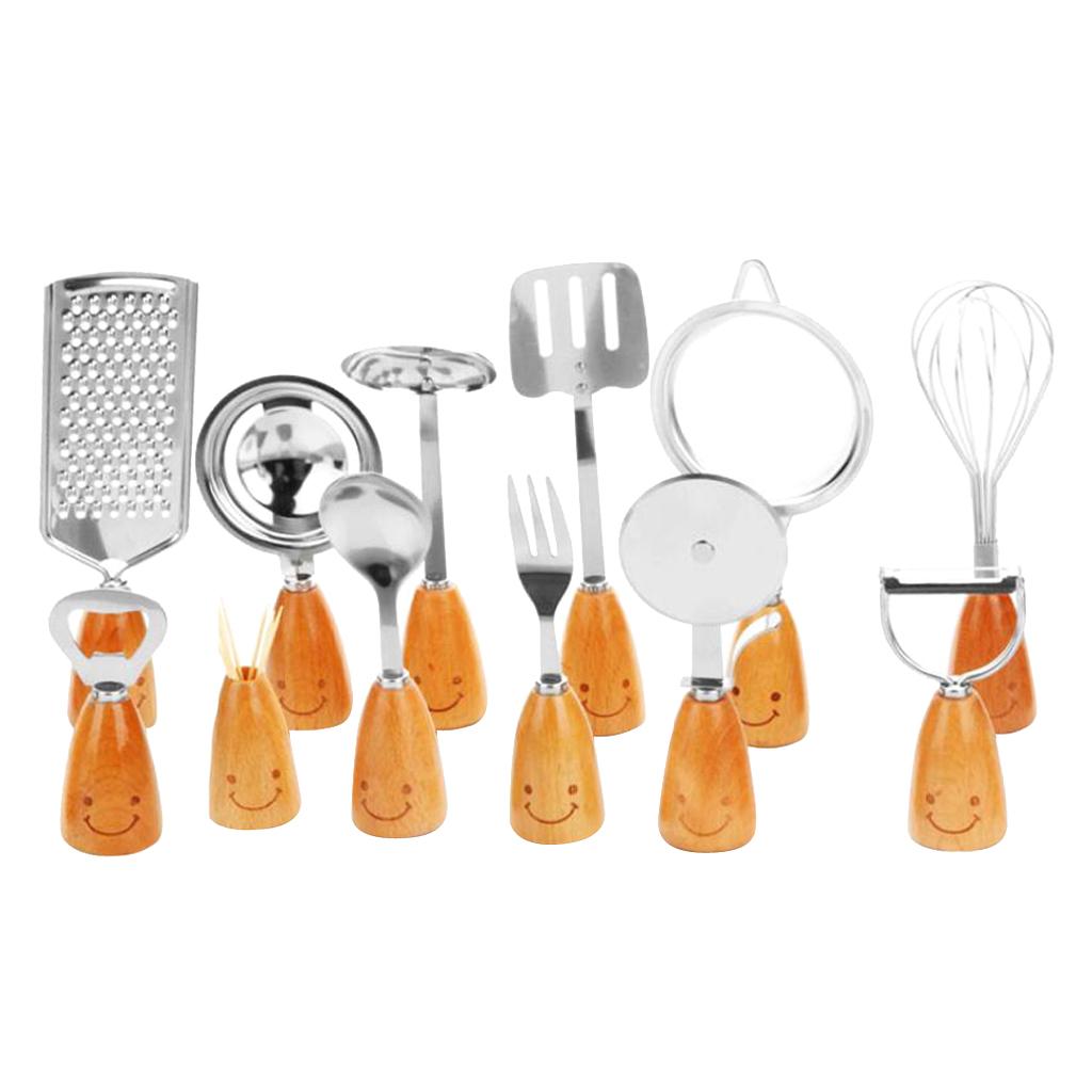 Includes: Egg divider, Dinner spoon, peelers, Flour Sieve, Ladle, Fruit fork, Bottle opener, Egg beater, Pizza Cutter, Grater, toothpick holder, Slotted Turner