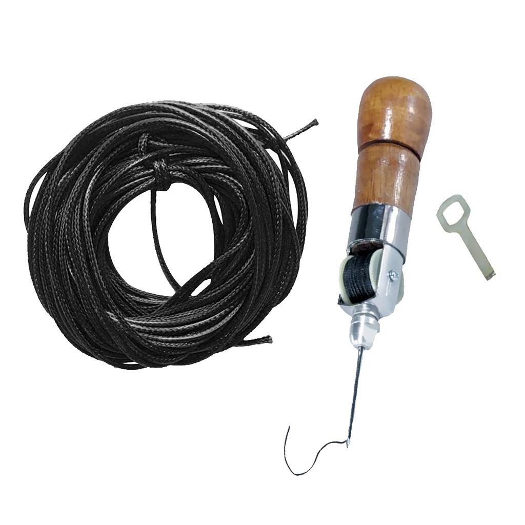 The awl carries a spool of waxed polyester black thread on the handle, easy to use, hollow handle holds extra curved needle and wrench.