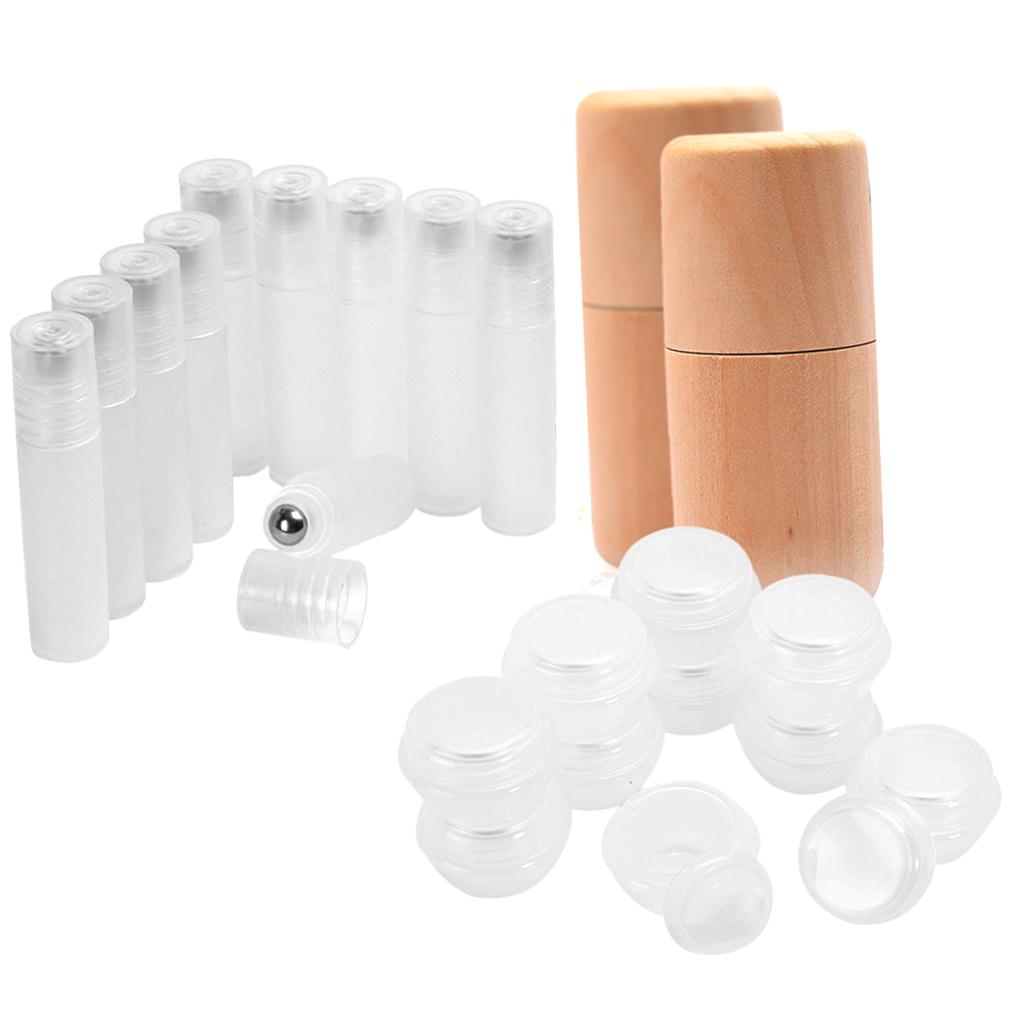 Jars for sampling of eyeshadows creams, wooden bottle for essential oil,Roll-on bottles for perfume and others liquids cosmetics.