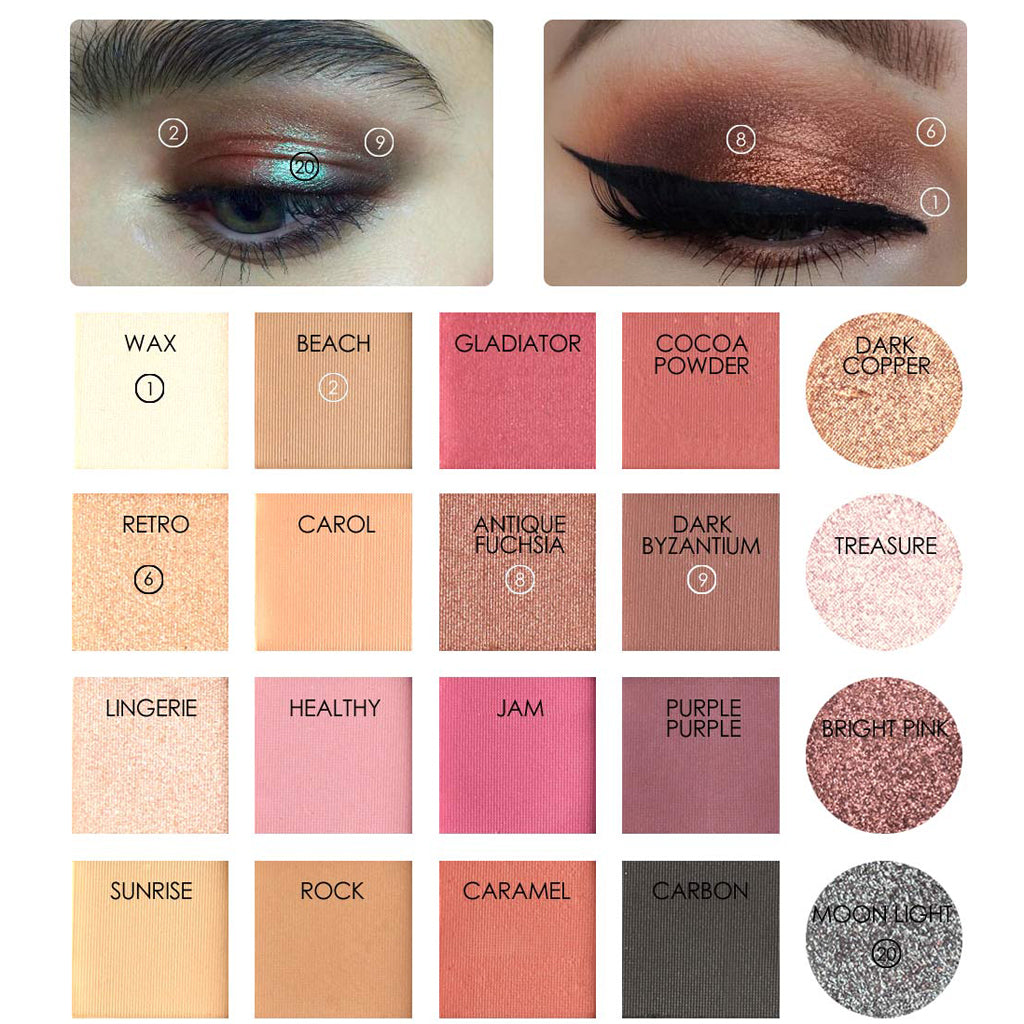 20 Colors different highly pigmented pressed powder eye shadows palette, great for exploring colors and makeup artistry. Suit for different occasions, like casual, salon, party, wedding, etc...
