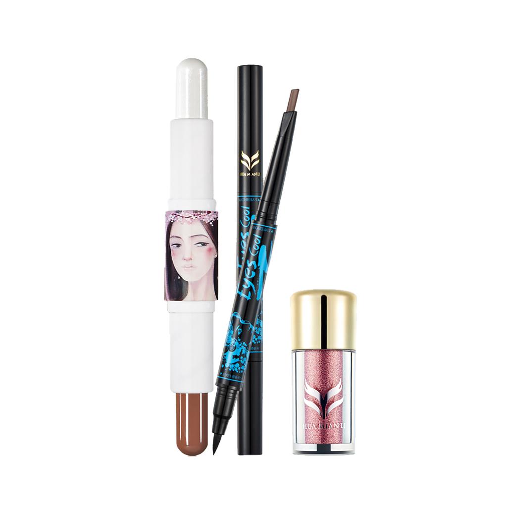 3pcs Double Ended Highlight & Contour Concealer Stick Highlighter Makeup Eyebrow Liquid Eyeliner Pen Eyeshadow Powder Makeup