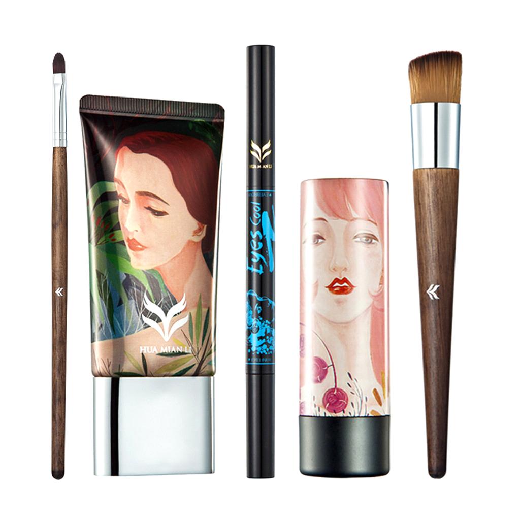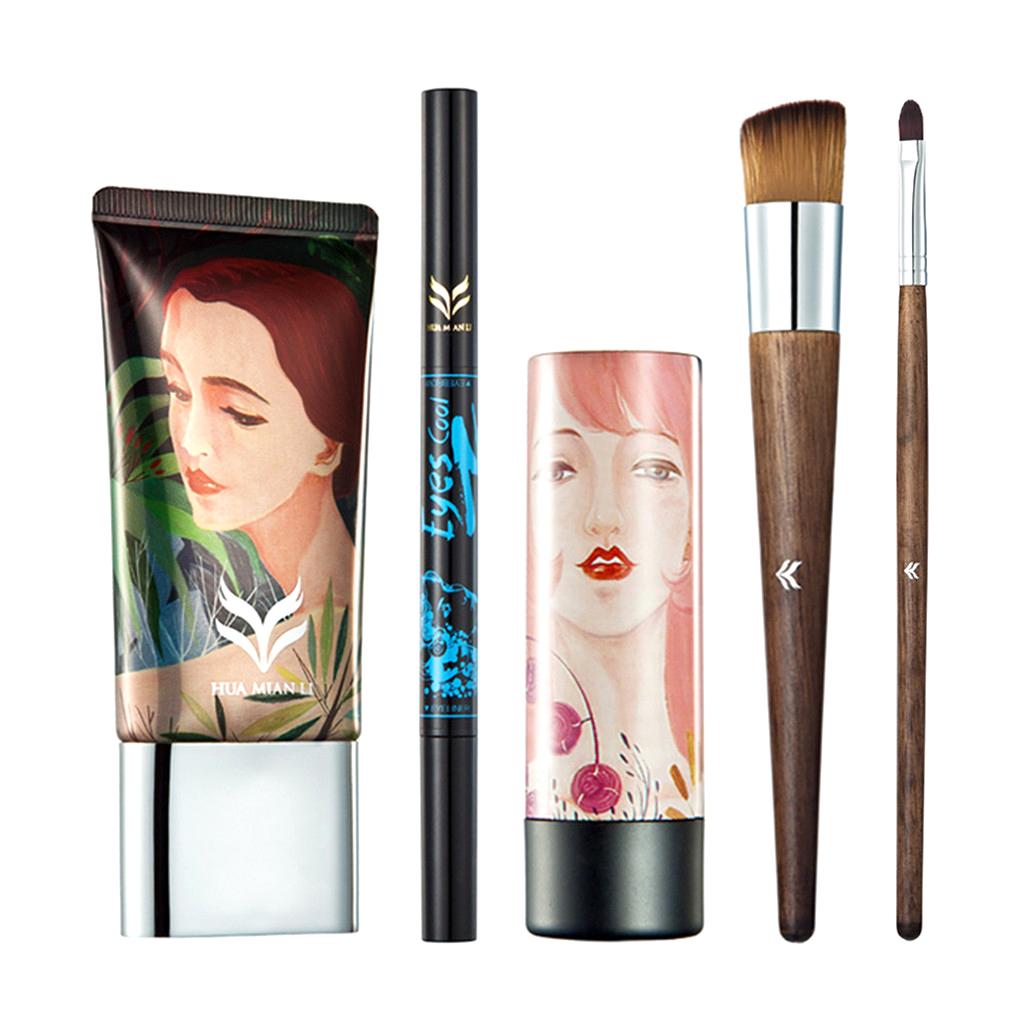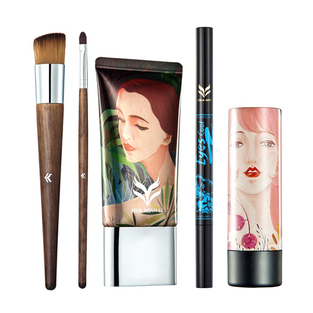 Lot 5 Pcs Cosmetic Set Liquid Foundation Double Head Eyeliner Eyebrow Pen Shimmer Lipstick Makeup Brushes Kit
