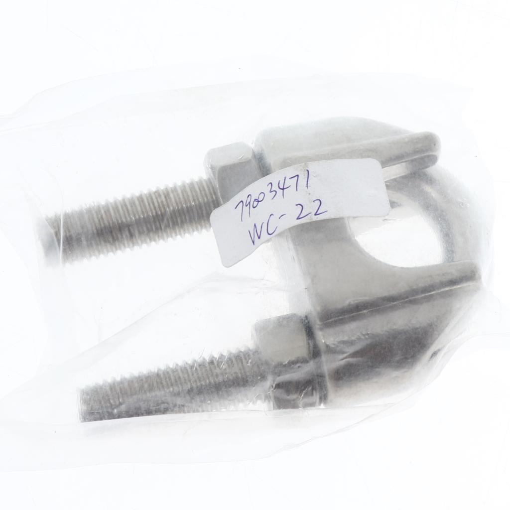 U-shaped bolt with a special insert, designed to clamp a wire rope to itself, works well with thimble
