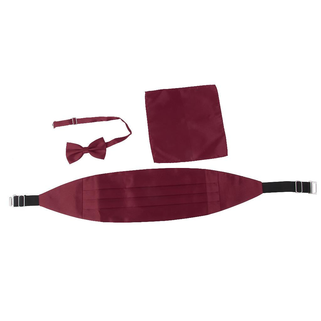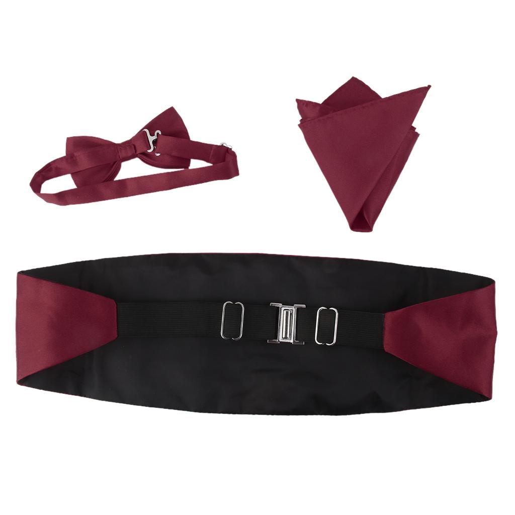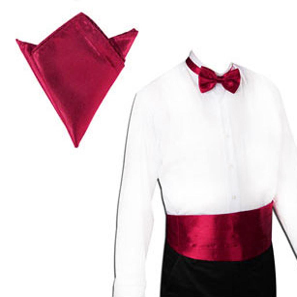 3pcs Men's Satin Bow Tie Cummerbund Hanky Handkerchief Wine Red