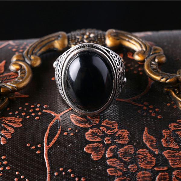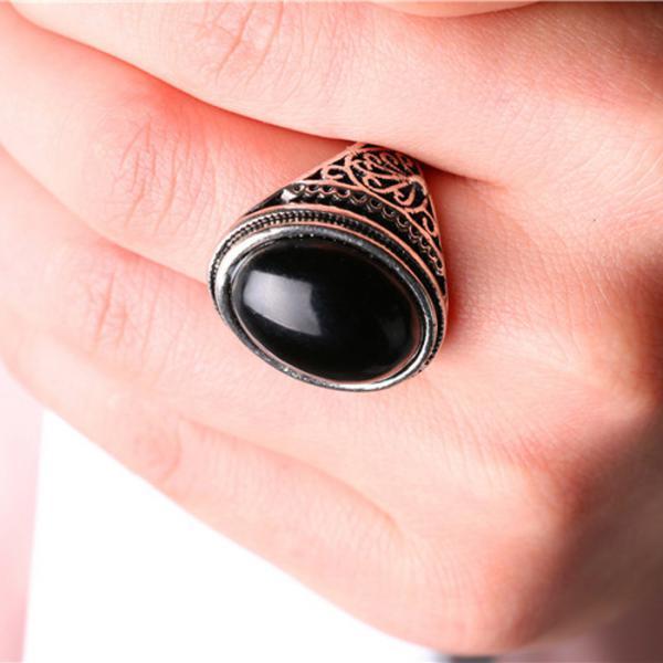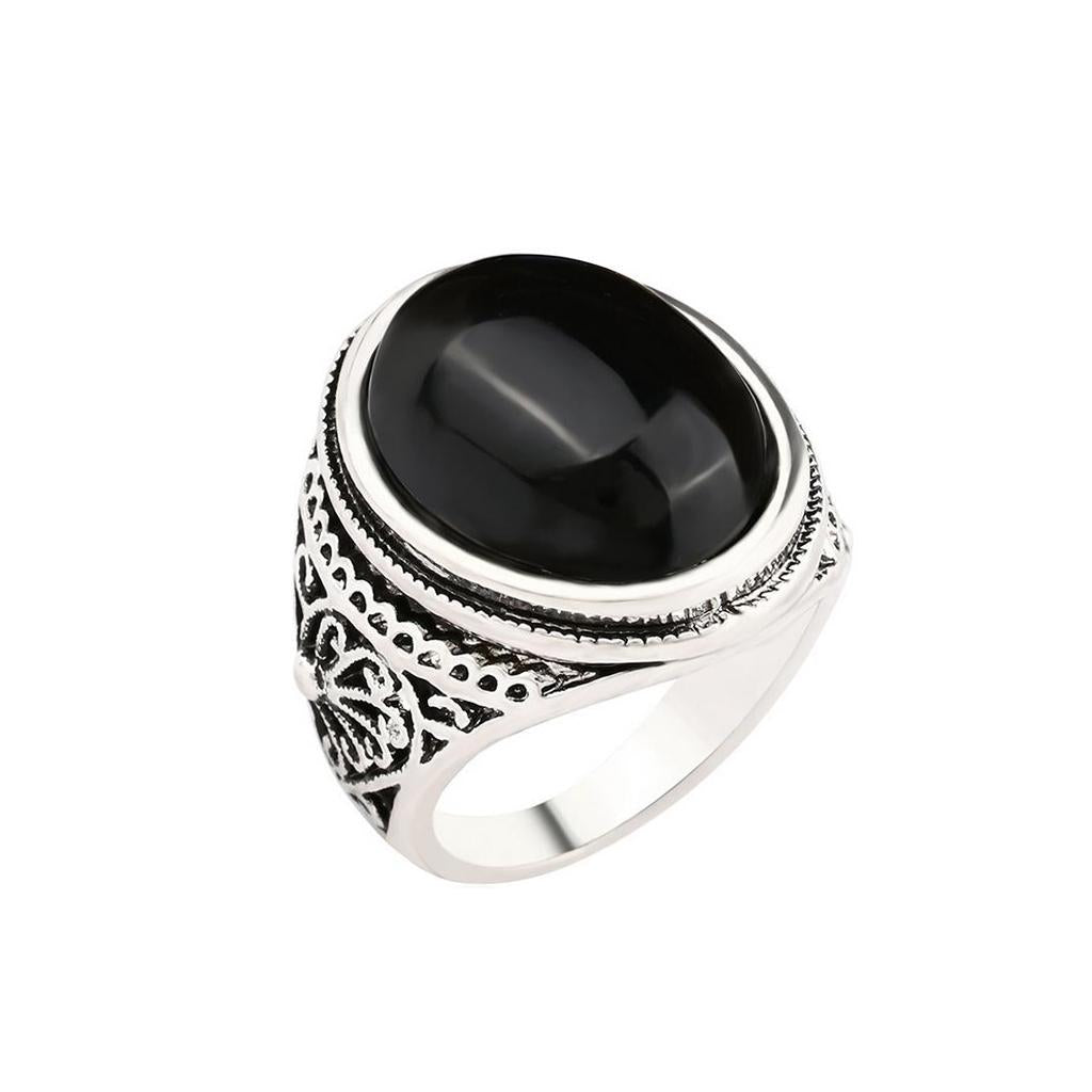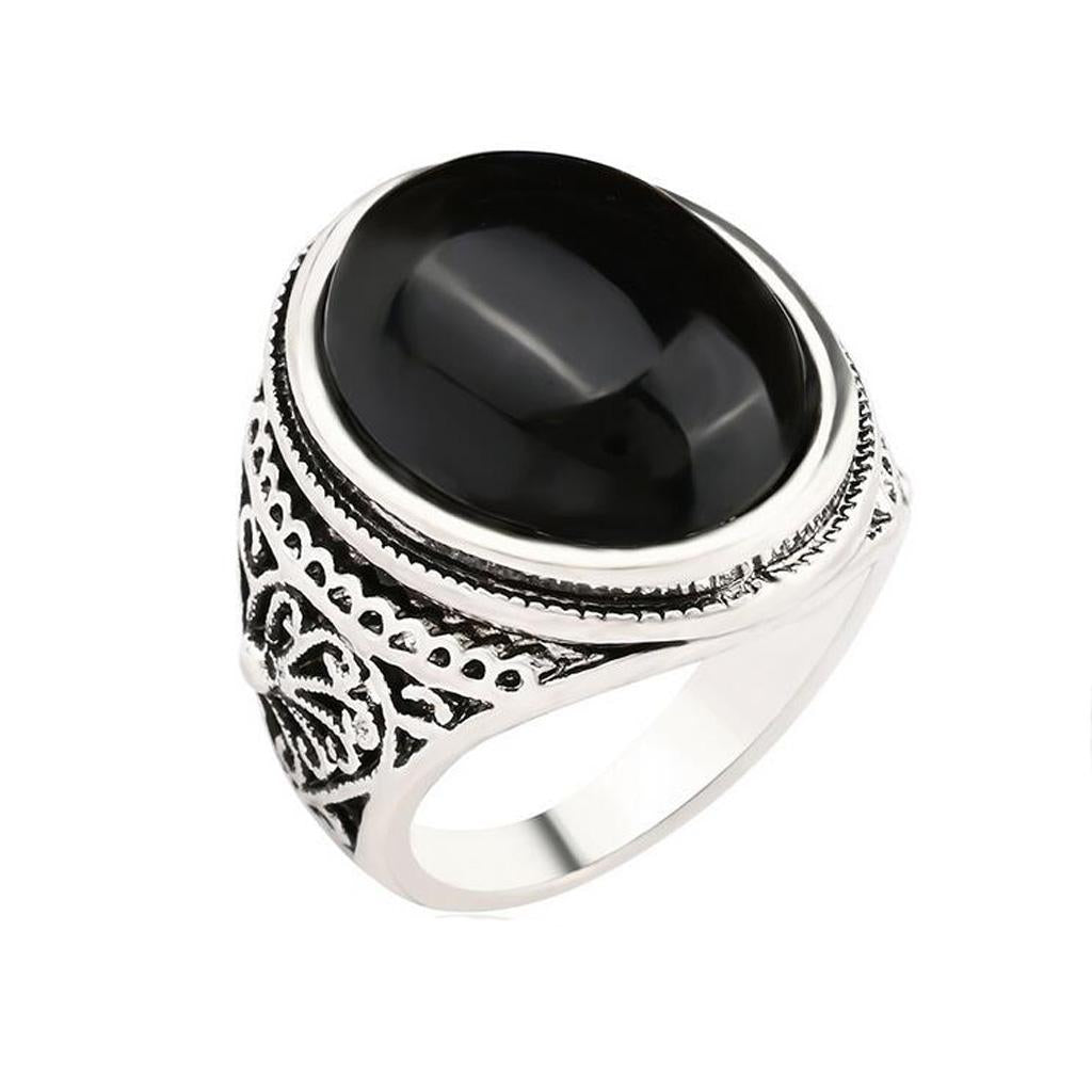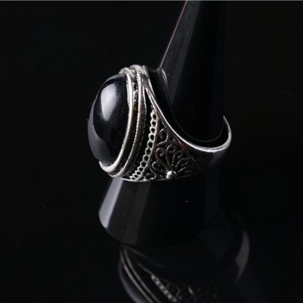 Mens Jewelry Vintage Round Ring Black Crystal Flower Carved Mens Ring 20mm